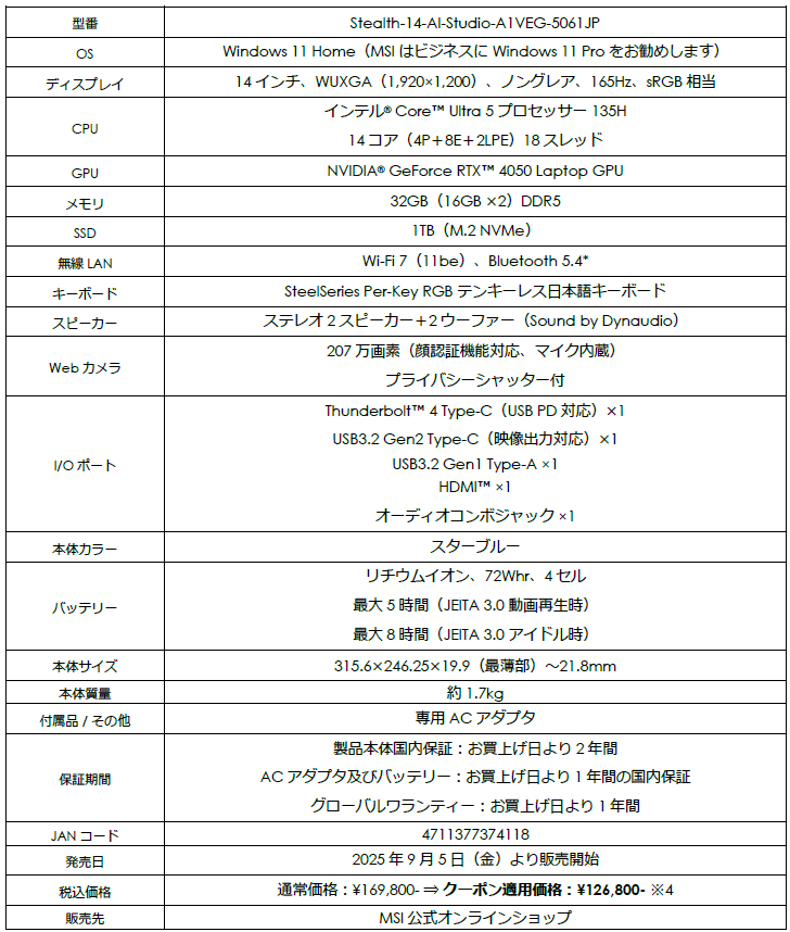 ・Stealth-14-AI-Studio-A1VEG-5061JP販売ページ:https://jpstore.msi.com/shopdetail/000000000957