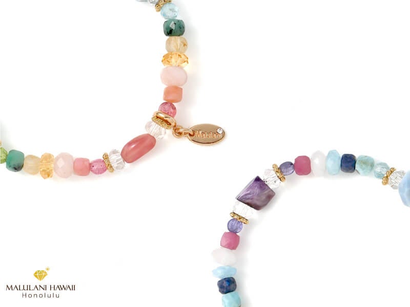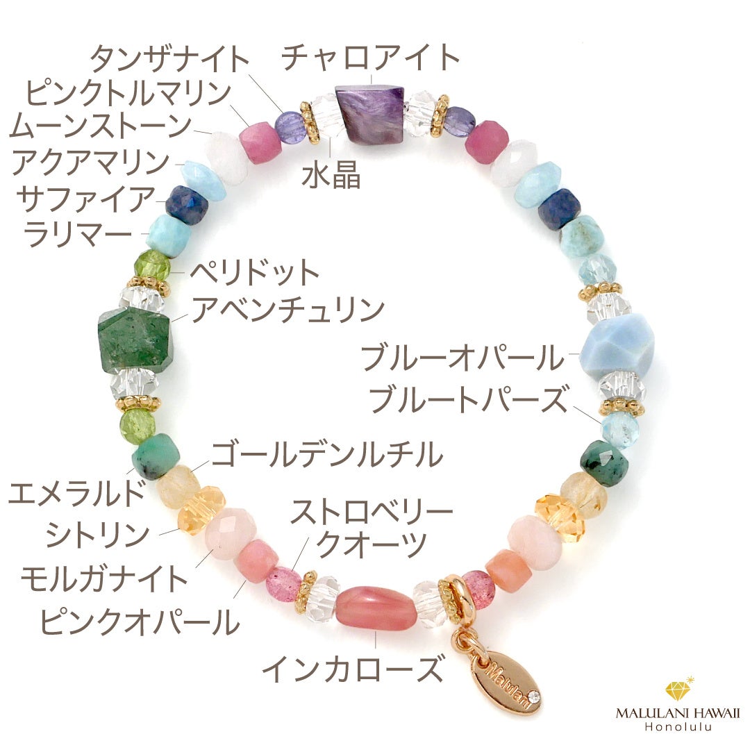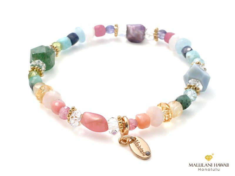 「ハワイの幸運」をイメージしたレインボーカラーのストーンは、チャクラのバランスを整え、心身、状況ともに活性と安定をもたらしてくれる頼もしい組み合わせ。