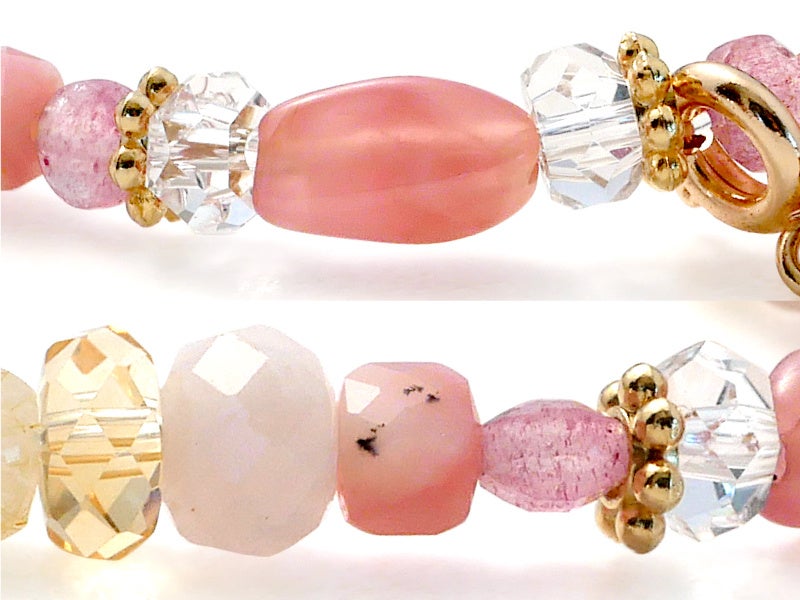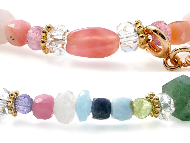 17種類の天然石をバランス良く配置し、エレガントに仕立てたブレスレットは、恋愛運や金運、健康運や厄除けなど、パワーストーンを持つときに託したい意味を持つ天然石が満載。