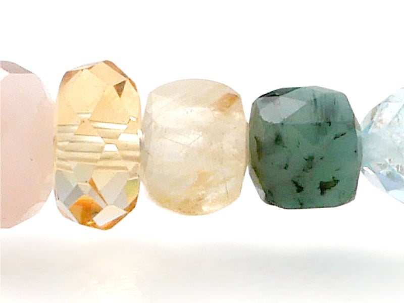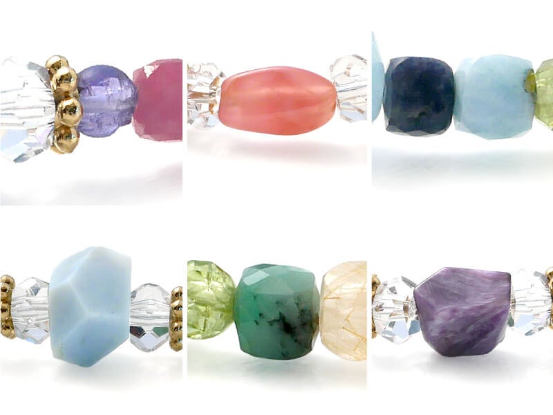 タンブルカットやボタン、コインやラウンド、スクエアなど、少しずつ異なるカットのストーンを配し、おしゃれなジュエリーとしてもお楽しみいただけるよう仕立てました。