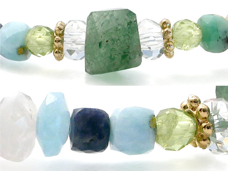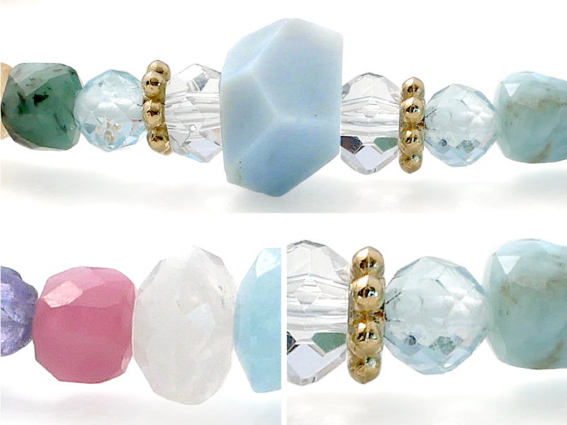エメラルドやサファイア、タンザナイトなど宝石としても人気の石や、チャロアイトやインカローズ、ラリマーやブルーオパールなど、パワーストーンとして珍重されている石なども配し、レア感満載のブレスレットとなりました。