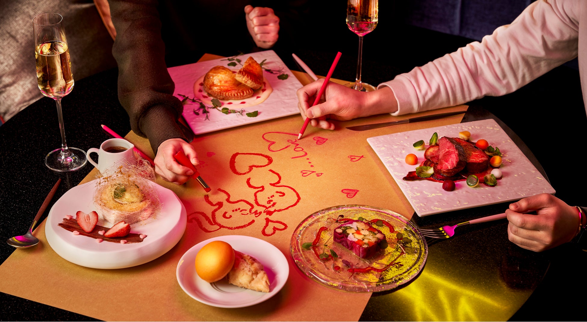 アロフト大阪堂島では、バレンタインカラーの「赤」を取り入れた、前菜、メイン、デザートと、コース仕立てで楽しむバレンタイン限定のディナーをご用意しました。メインは肉と魚からチョイスでき、スパークリングワインも1杯サービスします。さらに、バレンタインならではのお楽しみとして、テーブルクロスの代わりに、クラフトペーパーをご用意。口紅で楽しくお絵描きをしたり、さりげなく愛を表現してみたりなど、楽しみ方は十人十色。