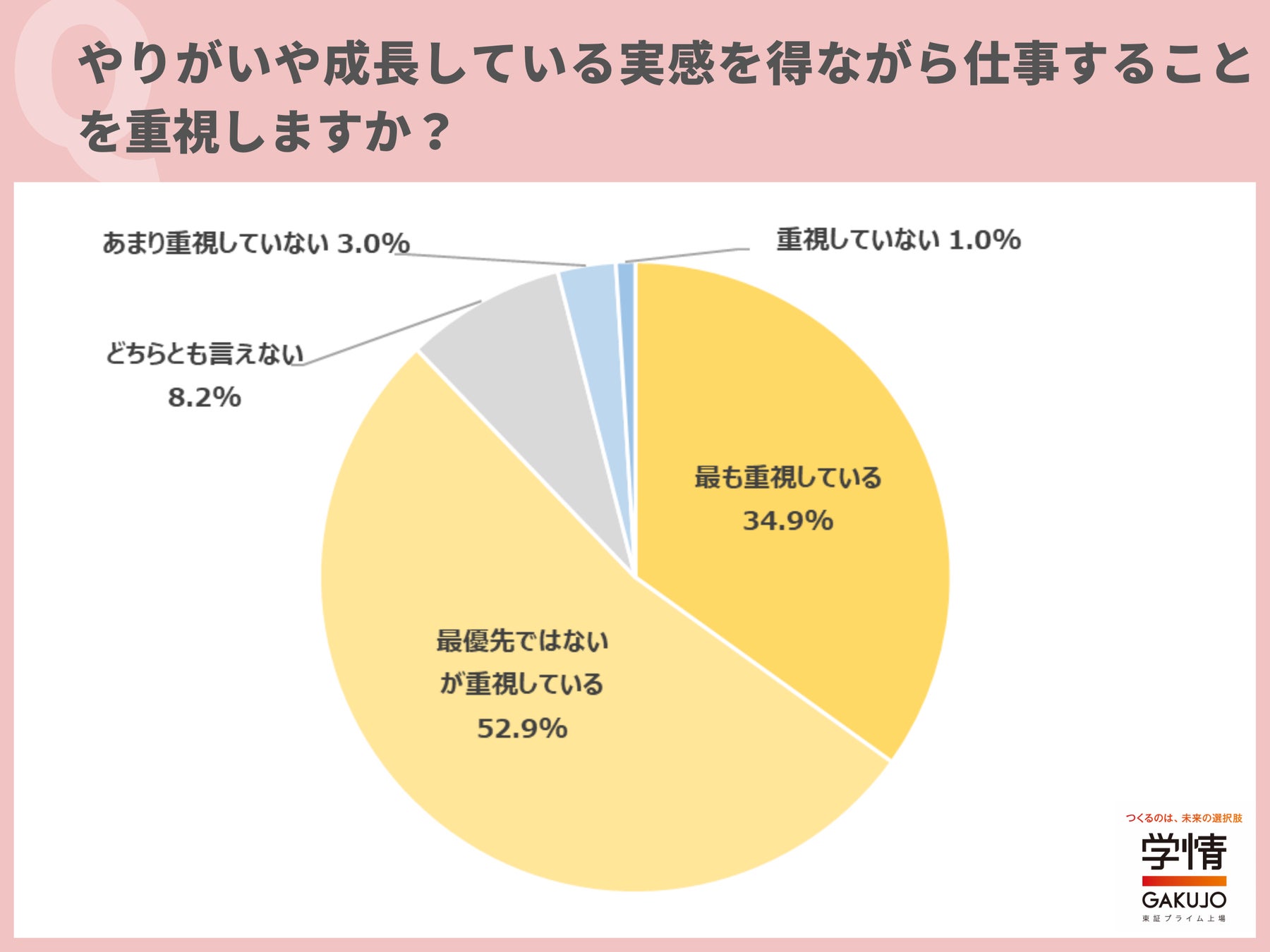 やりがいや成長実感を得ながら仕事をすることを、「最も重視している」と回答した学生が34.9%に上りました。「最優先ではないが重視している」52.9%を合わせると、やりがいや成長実感を得ながら仕事をすることを重視する学生が9割に迫ります。「長期間働く上では、やりがいは重要だと思う」「仕事を通して、社会に貢献しているという実感を得たい」「たとえ給与や福利厚生が希望通りでなくても、やりがいを感じられれば苦だと思わない」といった声が寄せられました。