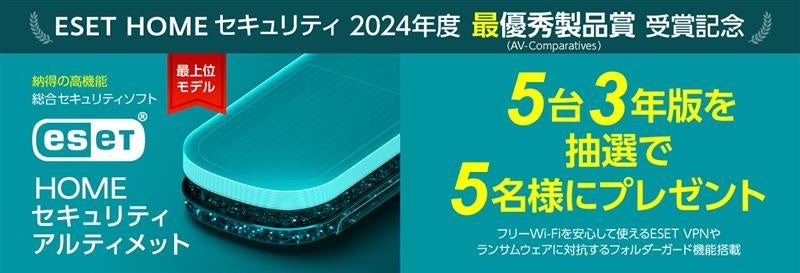 キヤノンマーケティングジャパン株式会社(代表取締役社長:足立正親、以下キヤノンMJ)は、個人向け総合セキュリティ対策ソフト「ESET HOME セキュリティ エッセンシャル」が世界有数の独立系テスト機関「AV-Comparatives」の2024年度・最優秀製品賞を受賞したことを記念し、2025年4月18日(金)よりプレゼントキャンペーンを開始します。抽選で5名に「ESET HOME セキュリティ」の最上位モデル「ESET HOME セキュリティ アルティメット」5台3年版をプレゼントします。