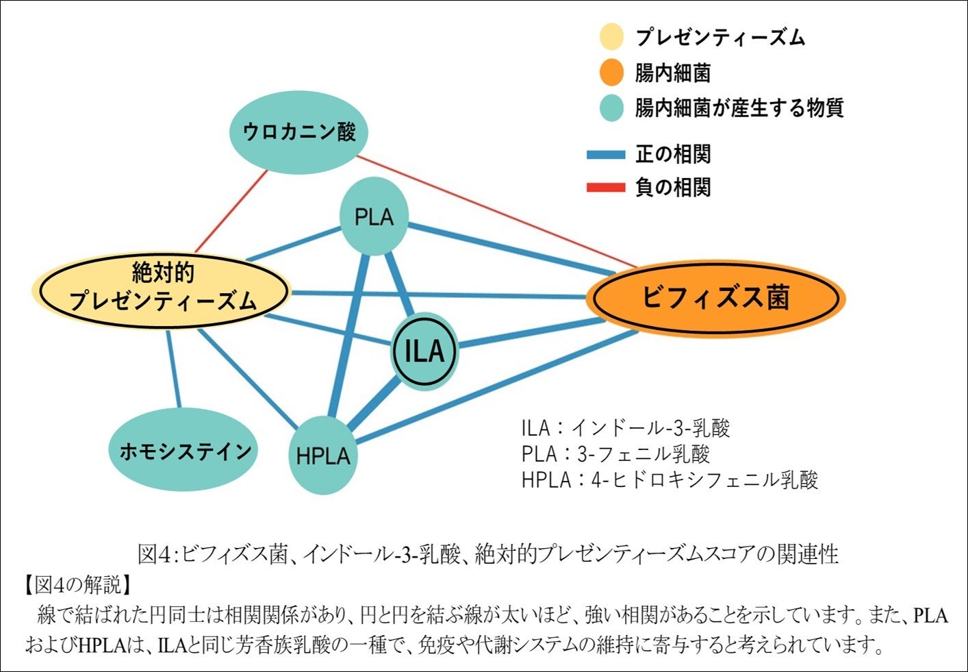 さらに、腸内細菌、腸内細菌が産生する代謝物質、プレゼンティーズムの関連性を調査したところ、ビフィズス菌、ILA、絶対的プレゼンティーズムスコアが、それぞれ正の相関を示しました(図4)。これは、ビフィズス菌が腸内で産生したILAなどの代謝物質が、プレゼンティーズムスコアの上昇、つまり労働パフォーマンスの改善に寄与している可能性を示唆しています。