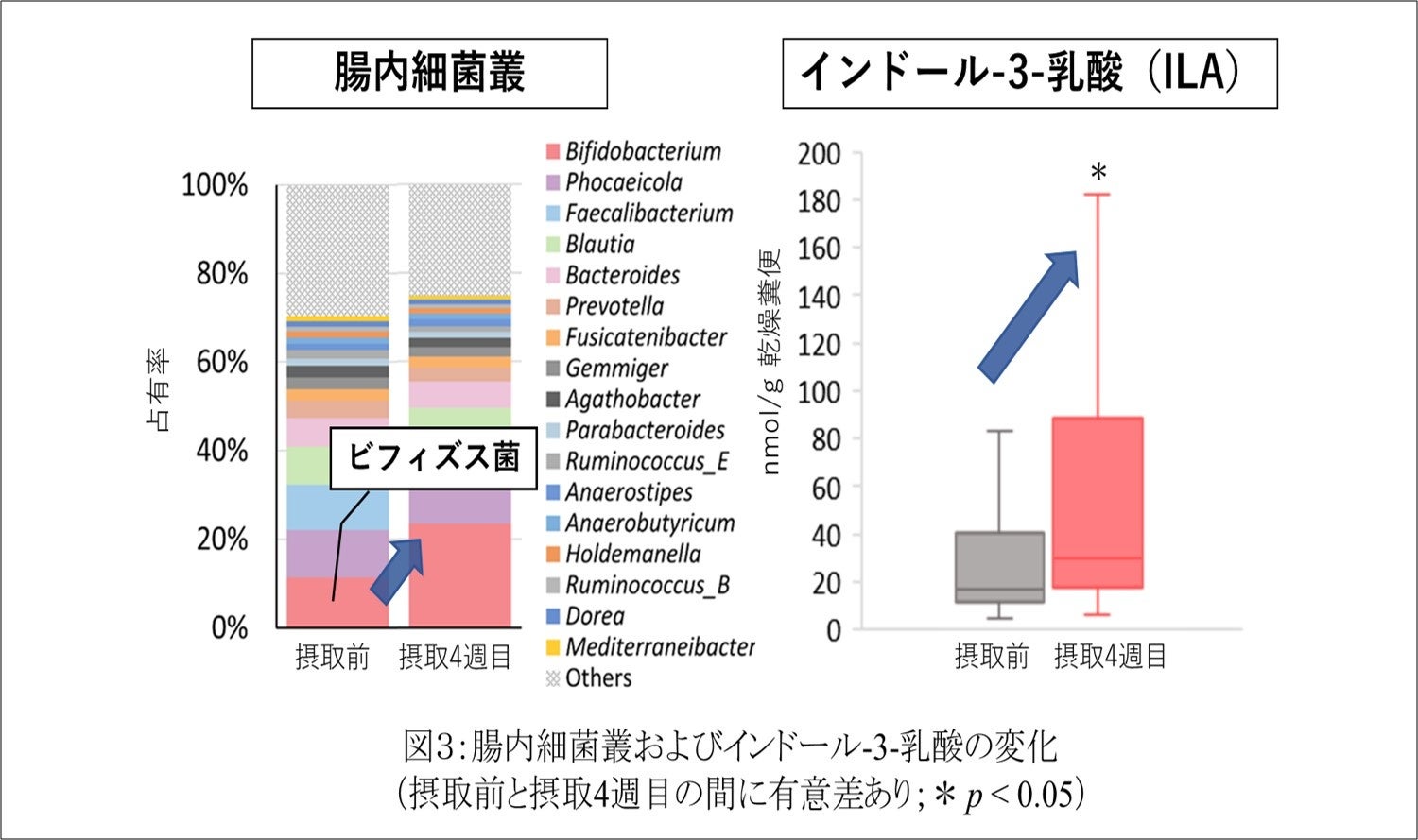 腸内において、ビフィズス菌と有用物質であるインドール-3-乳酸(ILA)が増加しました(図3)。ILAはヒトにすむ種類のビフィズス菌が産生する有用物質のひとつであり、脳機能の改善や免疫システムを強化すると考えられています。