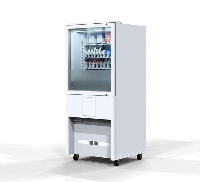 ロボットと連動した自動販売機です。自動販売機単体としてもご利用いただけます。 スマホ等で 自動販売機の飲み物注文してもらい、部屋番号を入力すると、ロボットが自動で自動販売機から飲 み物を受け取り、お部屋までお持ちします。