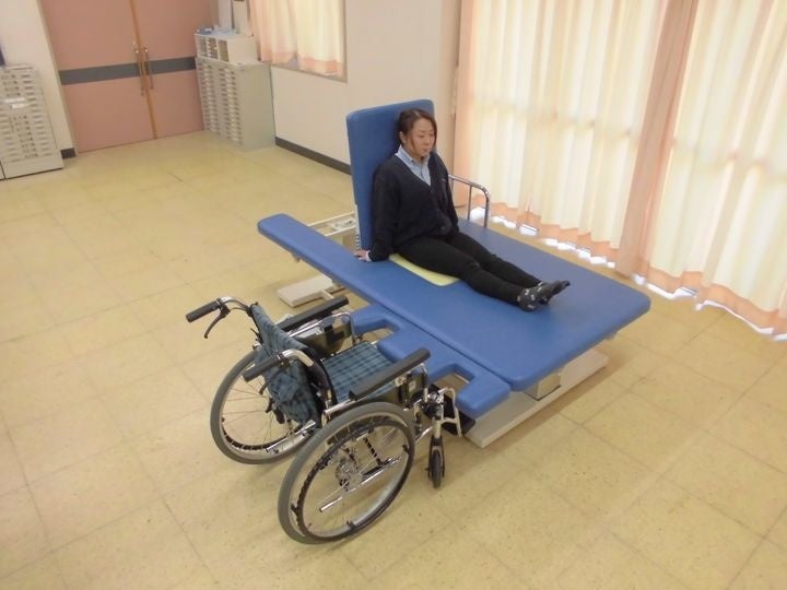 ベッド面に付属されている切り欠きフレームに車いすを合わせる事により、 自立にて一人で安全に 移乗できます。 背部分のマットが0度~90度まで上げ下げでき、長時間の座位姿勢に対応できます。 一般的な便器では姿勢が保持できず使用できなかったトイレが、トイレベッドがある事で、一人で移 乗して排泄できるようになれます。 ベッド面にはクッション性があり、長時間座った状態で対応可能