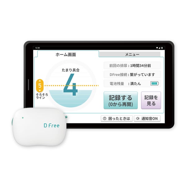 在宅介護向けの「DFree HomeCare」は、超音波センサーを下腹部に装着することで、ご利用者さ まの膀胱の尿のたまり具合を10段階で専用のお知らせ機器に表示し、トイレのタイミングを事前に お知らせする特定福祉用具です。