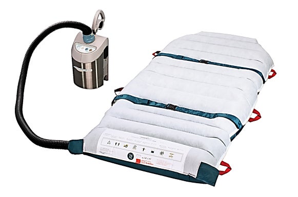 ・エアを利用する先端技術により、移送中の患者および介護スタッフの安全と快適さを向上させます。 ・エアで膨らませる空圧式マットで患者を安定した状態で移送するので、傷やあざを生じさせるリス クが少なくなります。 ・患者ひとりに一枚を使うと、器材再生や物流業務に関わるコストをなくし、と くに交差感染のリスクを大きく減じることができます。