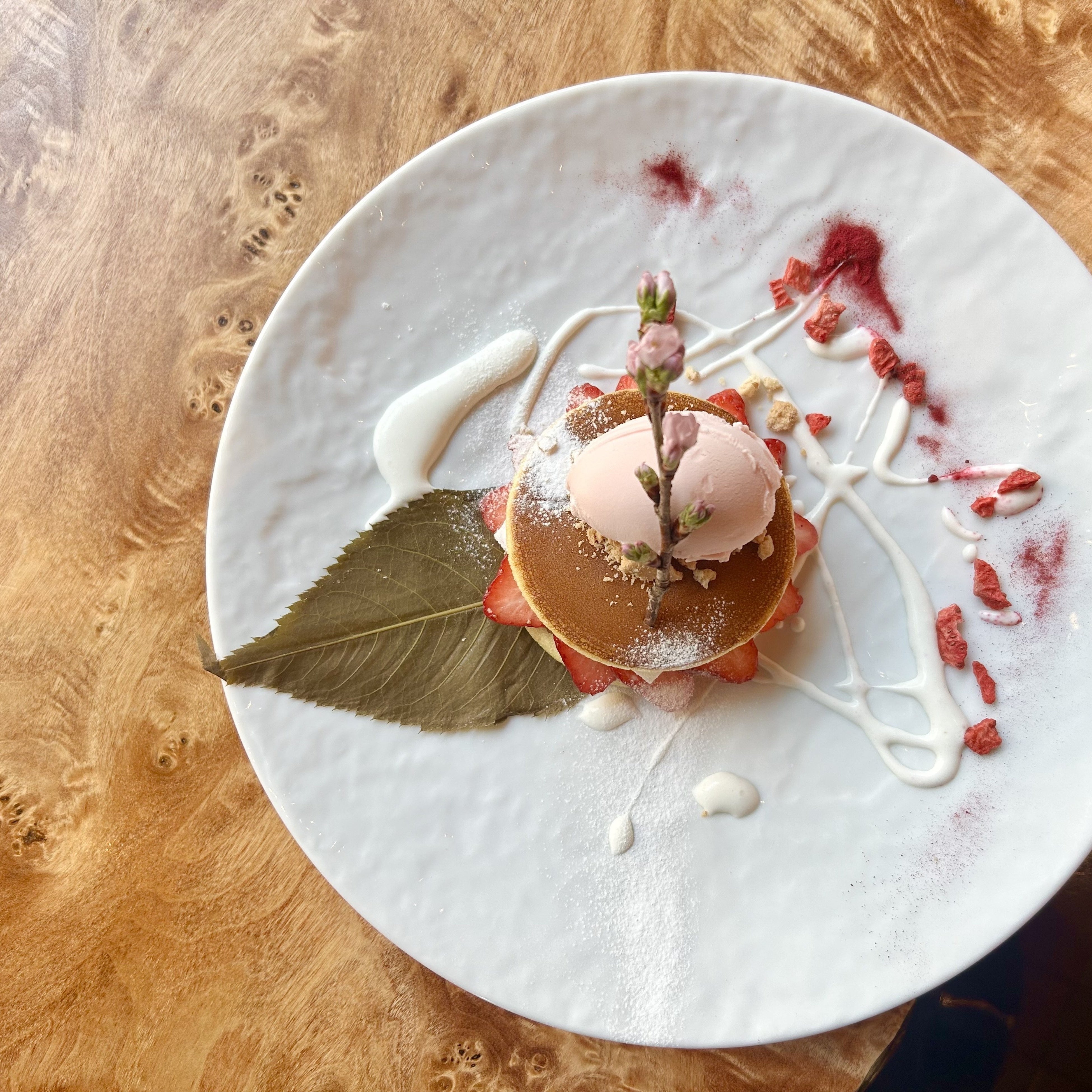 たっぷりのいちごとホイップクリームを挟んだふっくら柔らかなどら焼きを、桜のジェラートと一緒にお楽しみいただけます。桜の葉の香りと塩味がアクセントの和のスイーツに仕上げました。