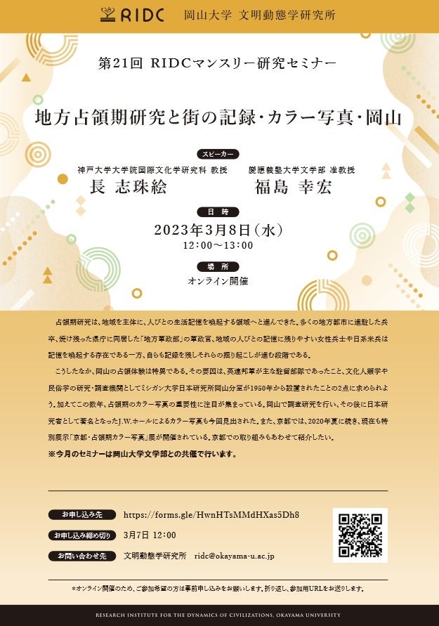 【岡山大学】文明動態学研究所「地方占領期研究と街の記録・カラー写真・岡山」〔3/8水, オンライン〕
