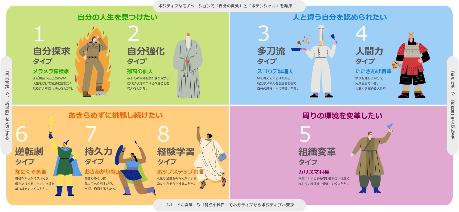 本サイトは、ベネッセが2024年3月に発表した「リスキリングに関する生活者理解のためのインサイト調査」*2(以下、インサイト調査)から見えた、多様な価値観や感情を基に個人が持つ「学びのモチベーション」8タイプが診断できるサイトです。「仕事をしやすいと思う環境」や「スキルを身に着けるときの価値観」、「失敗した時の行動」など10個の質問に回答すると、自身の学びのモチベーションタイプを知ることができます。あわせて、自身のタイプに合ったおすすめのUdemy講座も紹介されるため、自分により適した学びの一歩を踏み出すことに貢献します。