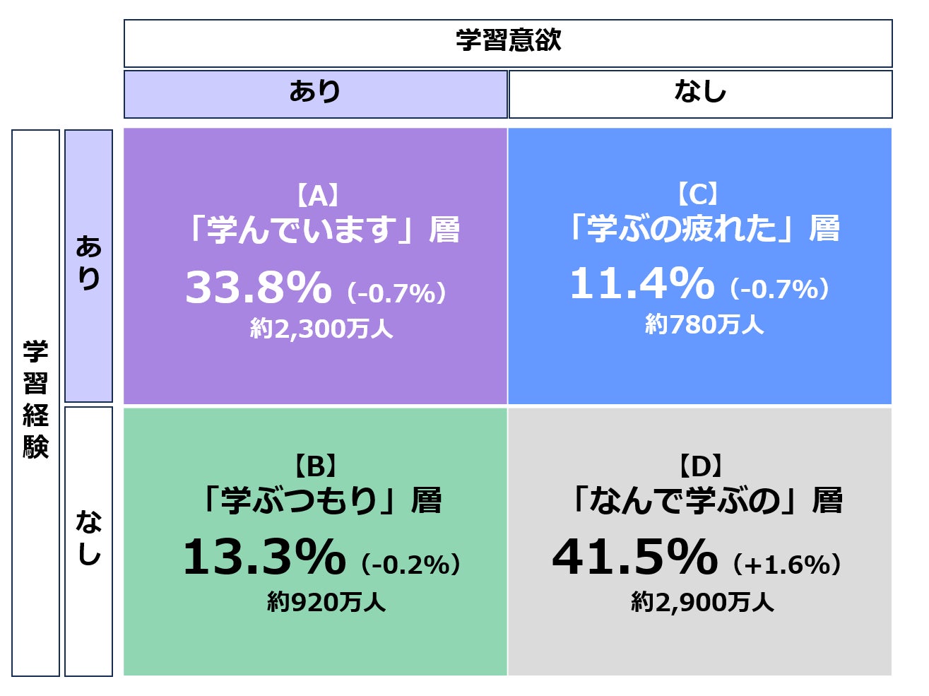 しかしながら、1年以内に学習経験も今後の学習意欲もない「学習意欲なし」層は42%と、2023年(40%)から微増し、2022 年(41%)からの3年間、社会人の約4割は「学習意欲なし」層でした。