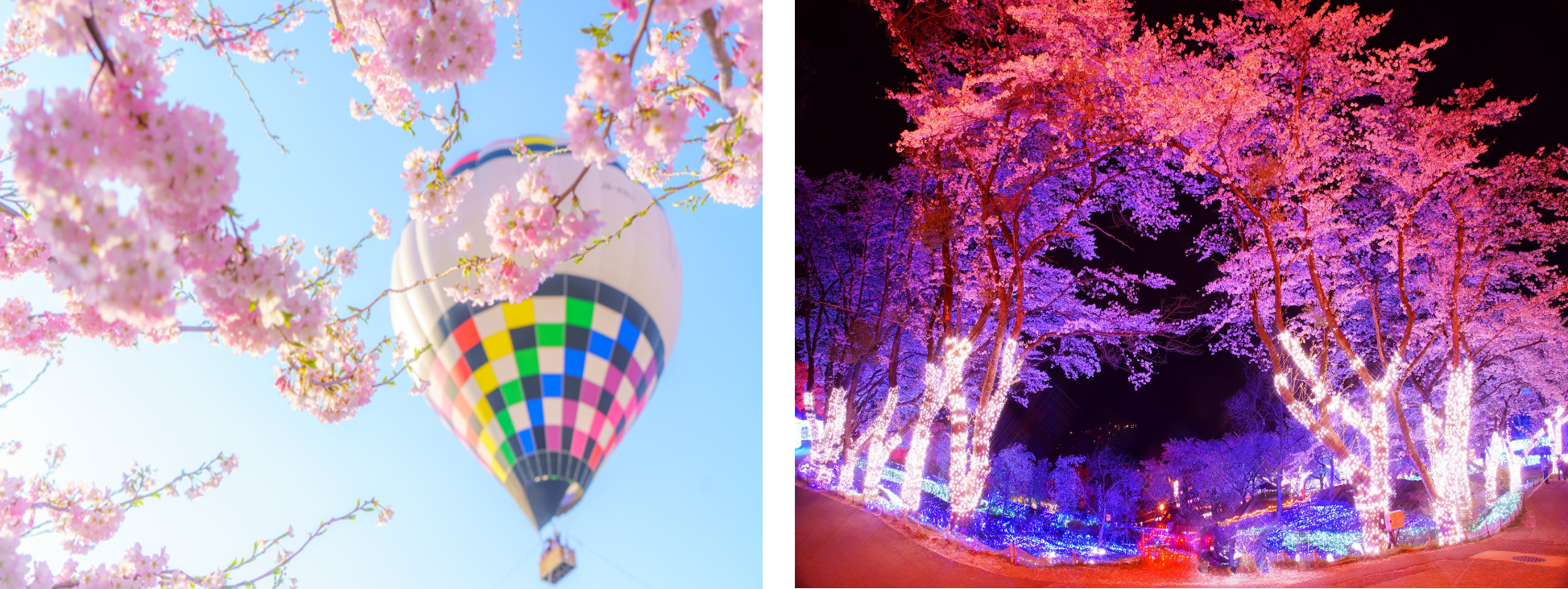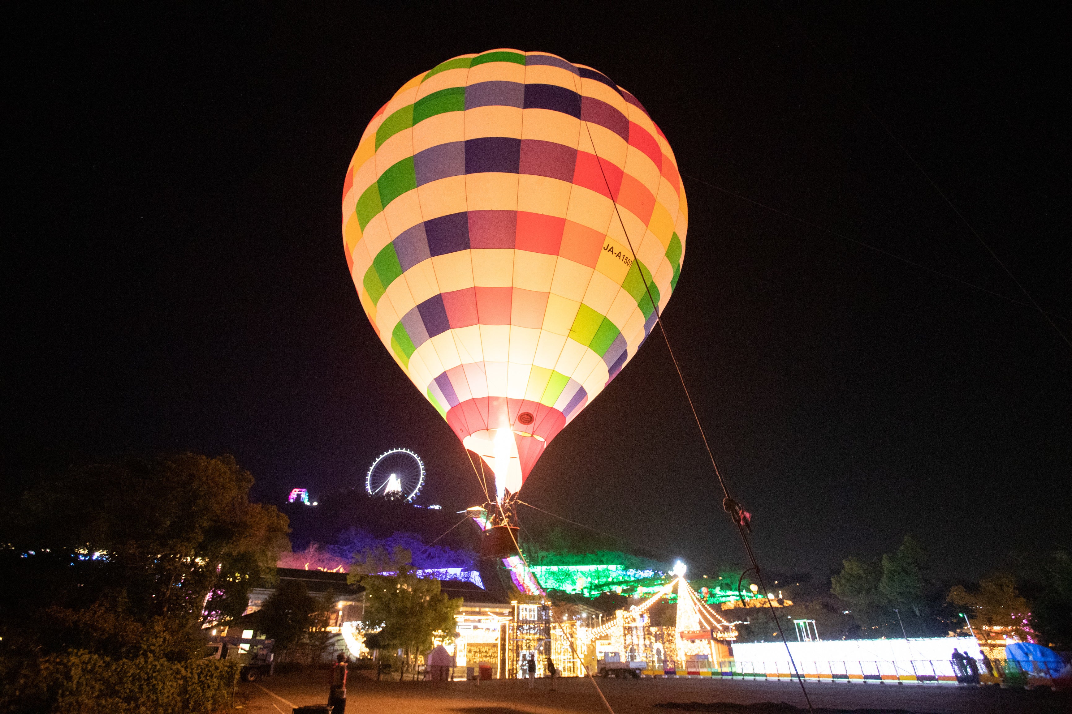 2日間限定で行う熱気球乗車イベントでは、上空15mの高さから色鮮やかな園内をゆったり見渡すことができます。特に夜は、関東最大級600万球のイルミネーションに照らされた2,500本の桜の幻想的な光景を眼下一面に見ることができおすすめです。