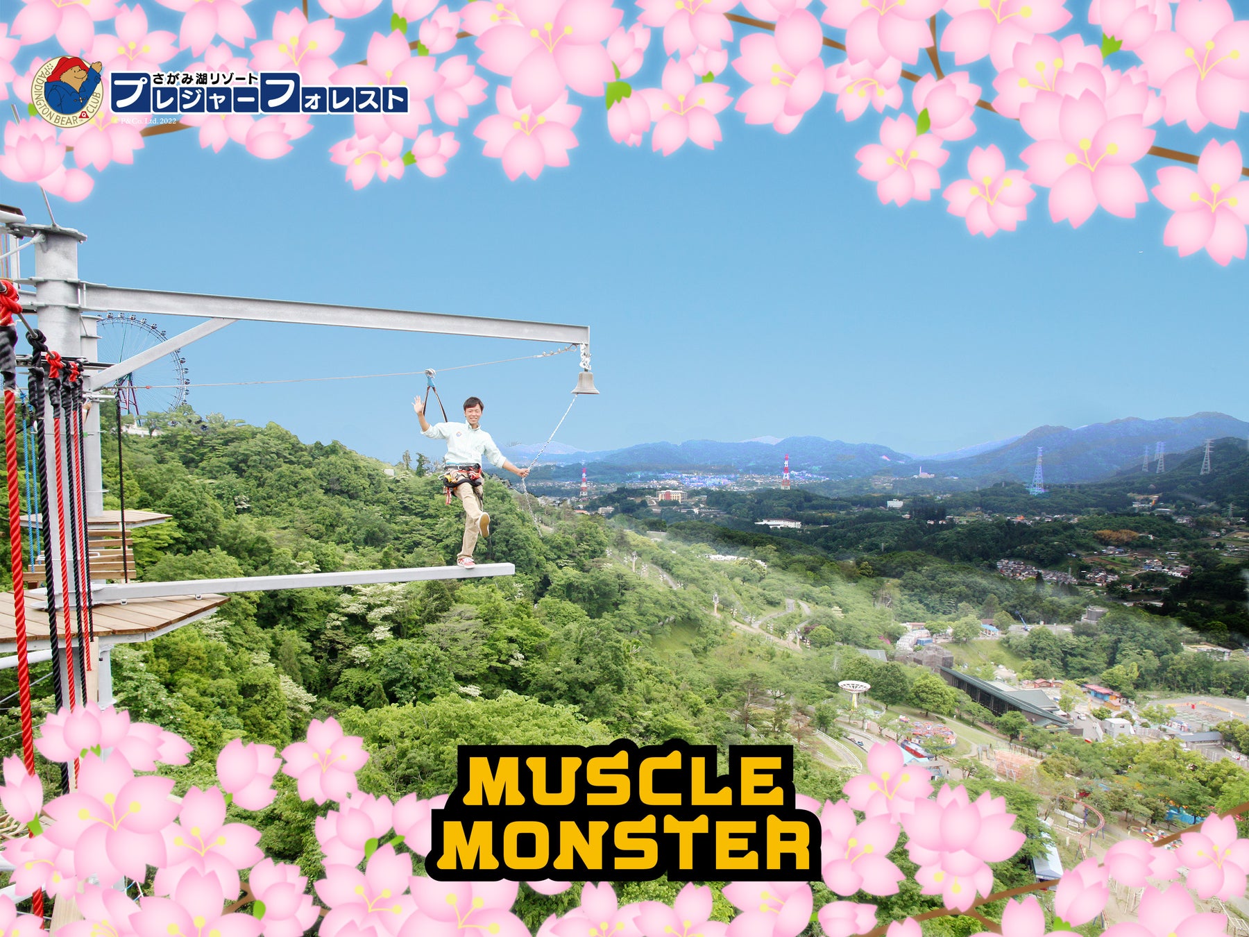 絶叫吊り橋 「風天」・巨大アスレチック「マッスルモンスター」で、体験中の写真撮影ができるフォトシステム「お写真撮りマッスル」では、期間限定で、桜のフレームで記念撮影ができます。
