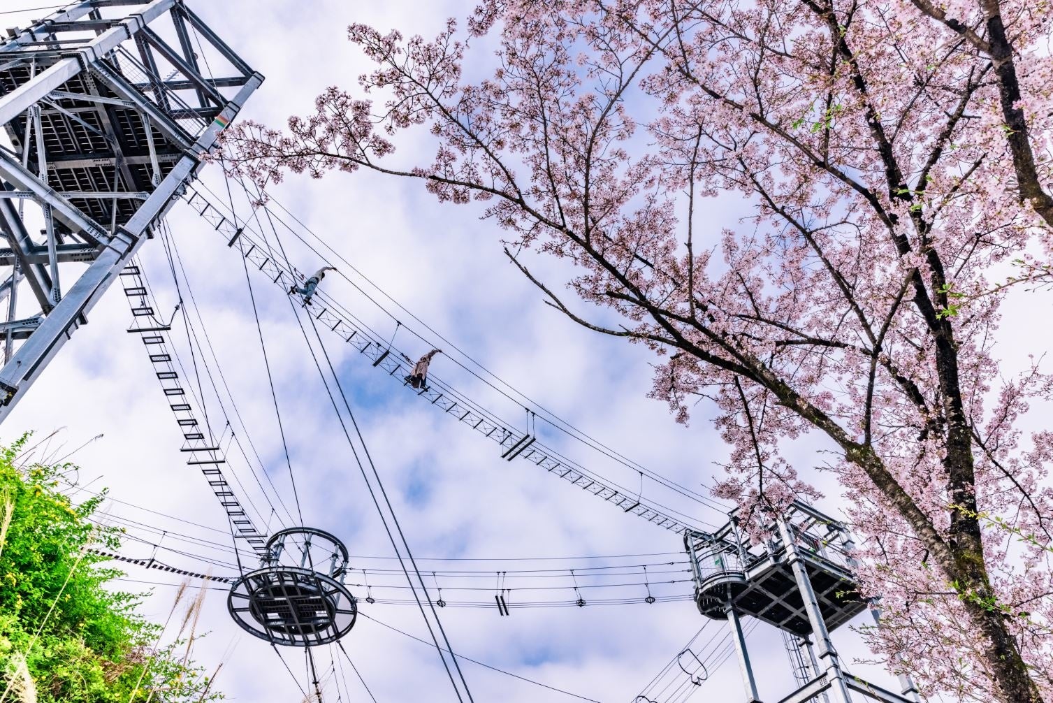 お花見アスレチック「マッスルモンスター」「風天」で “桜満開”写真撮影