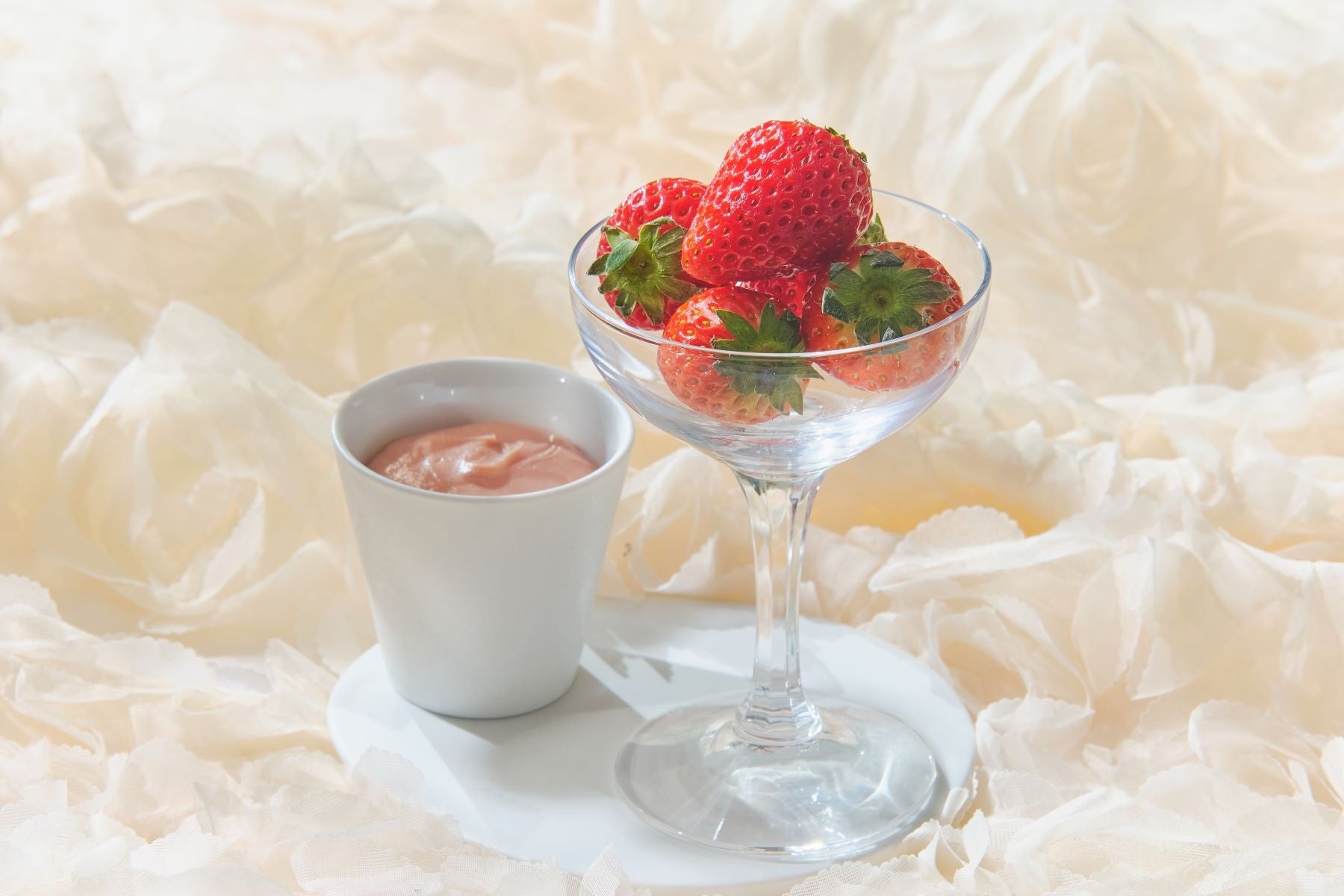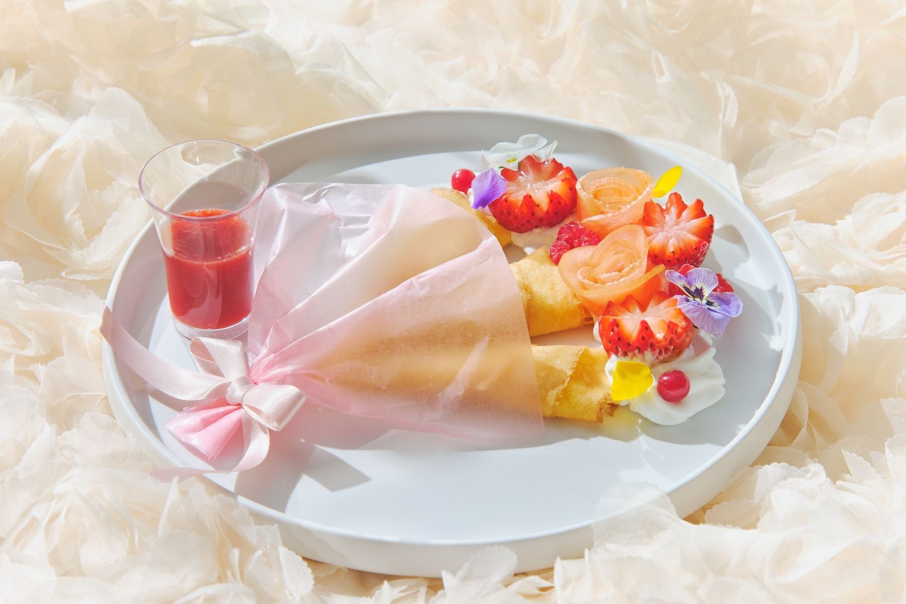 オプションとしてご用意する、大切な方へ花束を贈る時の幸福感を一皿に表現した「赤い果実のクレープブーケ」は、しっとりと焼き上げたクレープ生地に、旬のいちごの輝きとはじけるようなブルーベリー、彩り豊かなエディブルフラワーを束ねた、まるで本物のブーケのように心ときめくスイーツです。さらに、いちご好きにはたまらない、瑞々しいフレッシュのいちごを華やかなピンクガナッシュにディップして楽しむ、至福のひとときを添えるオプション商品も提供いたします。