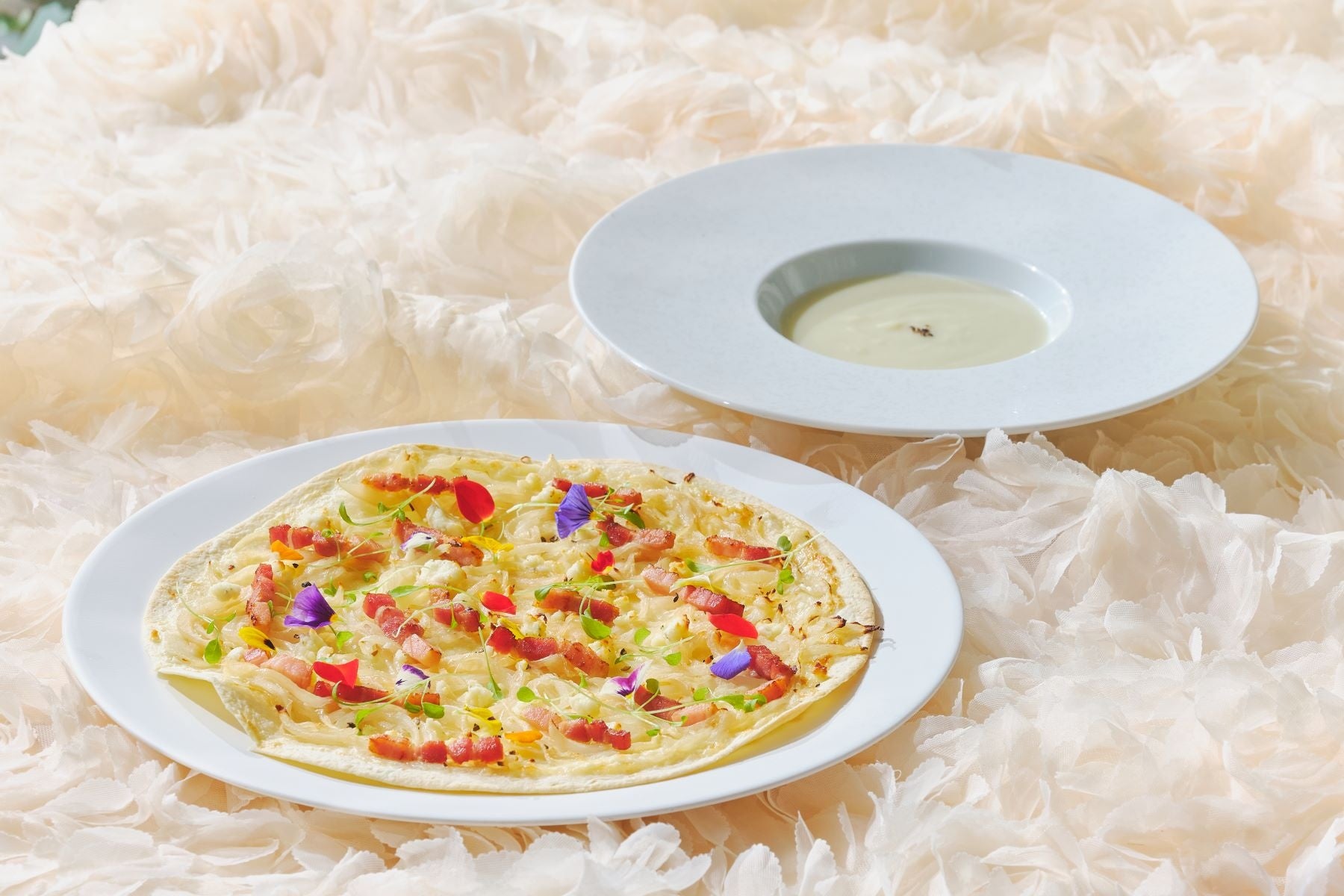 キャベツのクリームスープ/燻製ベーコンと玉葱のタルトフランベ