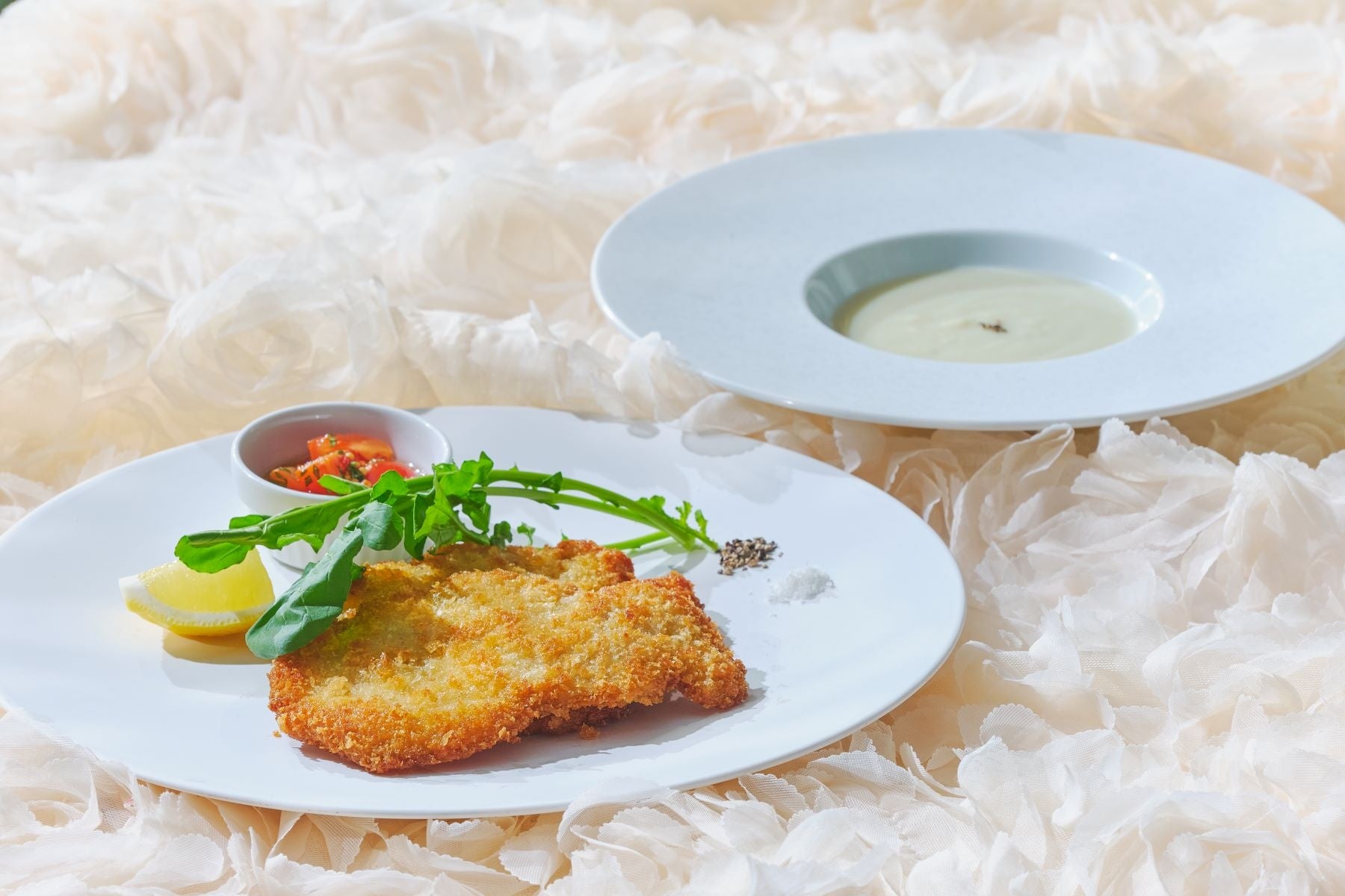 キャベツのクリームスープ/豚ヒレ肉のカツレツ 3種のコンディメントと共に