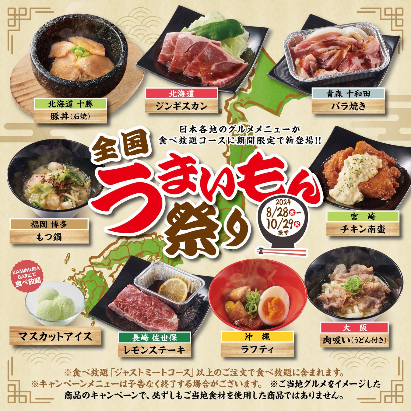 ワタミ株式会社(東京都大田区、以下ワタミ)と国内有数の和牛生産者であるカミチクグループ(鹿児島県鹿児島市)との合弁会社、ワタミカミチク株式会社(東京都大田区、以下ワタミカミチク)が展開する「かみむら牧場」は、2024年8月28日(水)から10月29日(火)の期間限定で、「全国うまいもん祭り」として北は北海道から南は沖縄まで日本各地のグルメメニューを「ジャストミートコース」以上の食べ放題コースにて提供いたします。