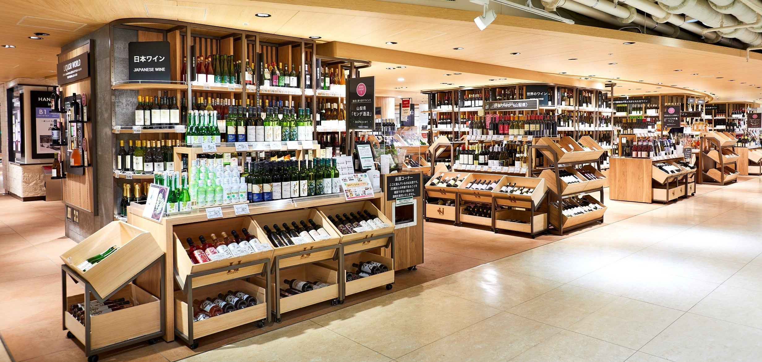和洋酒売場の特徴は、話題の「日本ワイン」の圧倒的な品揃え!大阪や山梨、北海道など約250銘柄を取り揃えています。