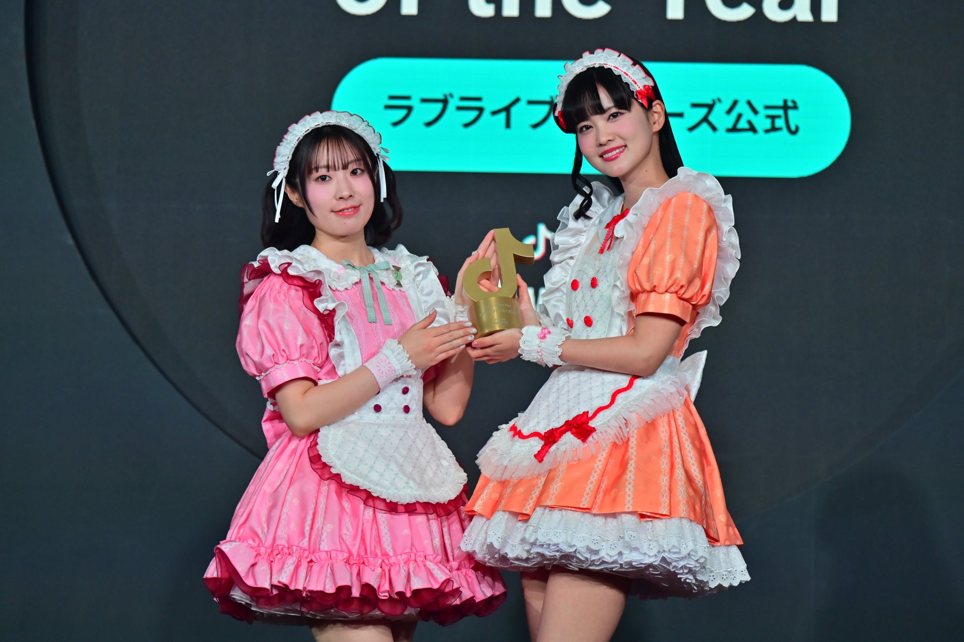 また、2025年を象徴する、最も注目を浴びた動画を表彰する今年新設の「Video of the Year」には、ラブライブ!シリーズ公式 (@lovelive_official)より、AiScReam「愛♡スクリ~ム!」の動画が受賞。本動画は、2025年11月時点で、TikTokでの総再生回数約2,500万回を突破。動画内の呼びかけフレーズが、国やジャンルを超えて幅広い世代に親しまれていることが高く評価され、2025年を象徴する動画に選出されました。アワードでは、「ラブライブ!」シリーズより黒澤ルビィ役の降幡愛、上原歩夢役の大西亜玖璃が登壇!受賞スピーチでは、2025年3月に投稿された動画が約2,500万回再生を突破する大ヒットを記録していることについて、「一番自分たちが驚いています。ファンの方も驚いているんじゃないかな。」とコメント。2025年の快進撃を振り返りました。