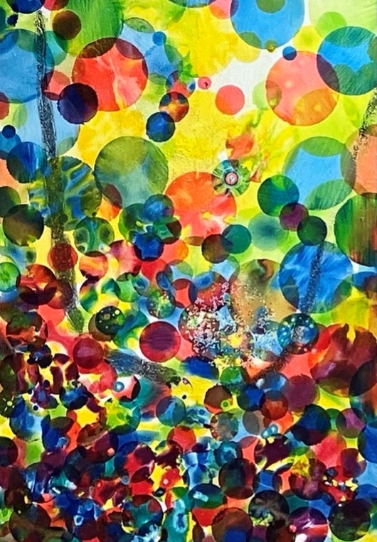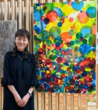 吉野公賀さんの作品『舞い上がる』は、様々な色や大きさの円がそれぞれ個性を発揮しながらも、共生し互いに尊重し、そしてつながり、ひとつの作品を創り上げていることから、JTBグループの経営理念にある、「平和で心豊かな暮らし」、JTBグループが取り組む「DEIB」の「D:多様性」や「B:心理的安全性」といった「安心感」が感じられる作品です。