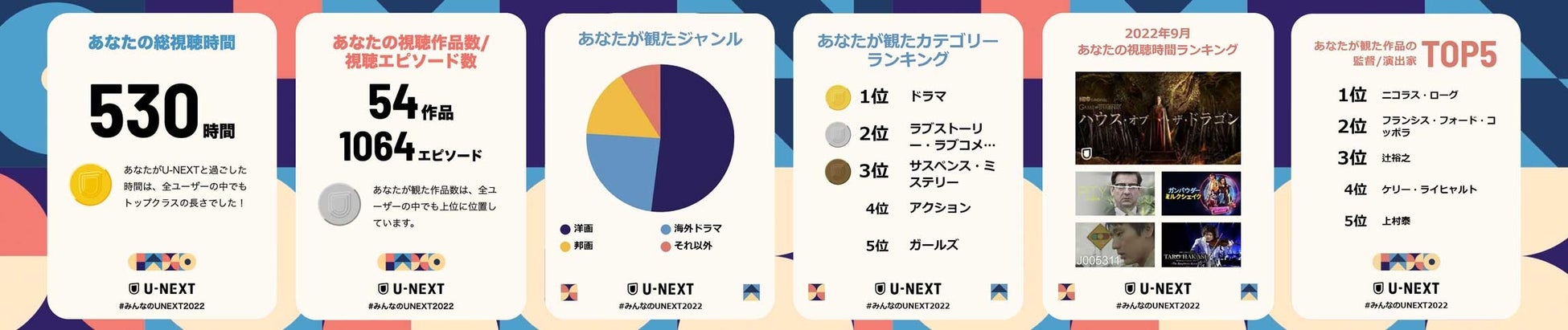 U-NEXTをご利用いただいたみなさんにありがとうの気持ちを込めてお届けします。ぜひ2022年のエンタメライフを振り返るきっかけとしてお楽しみください。
