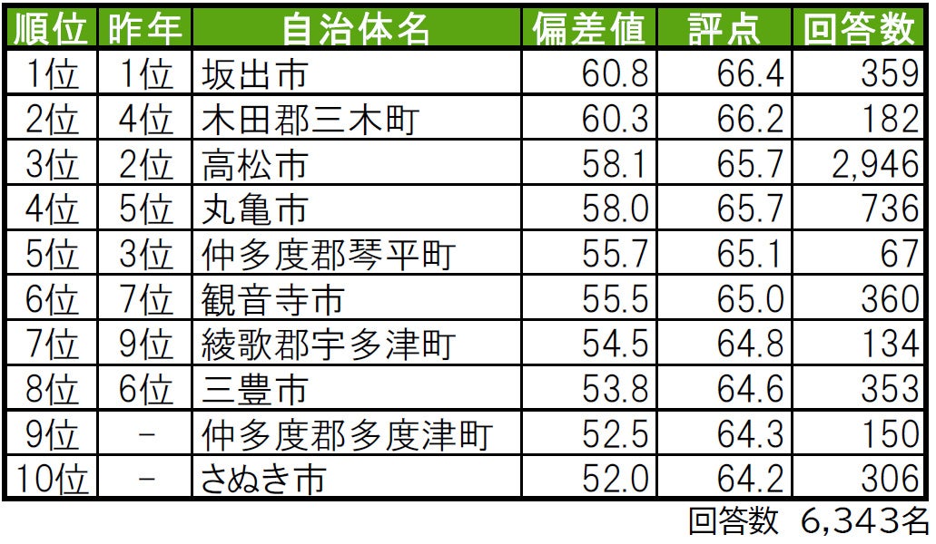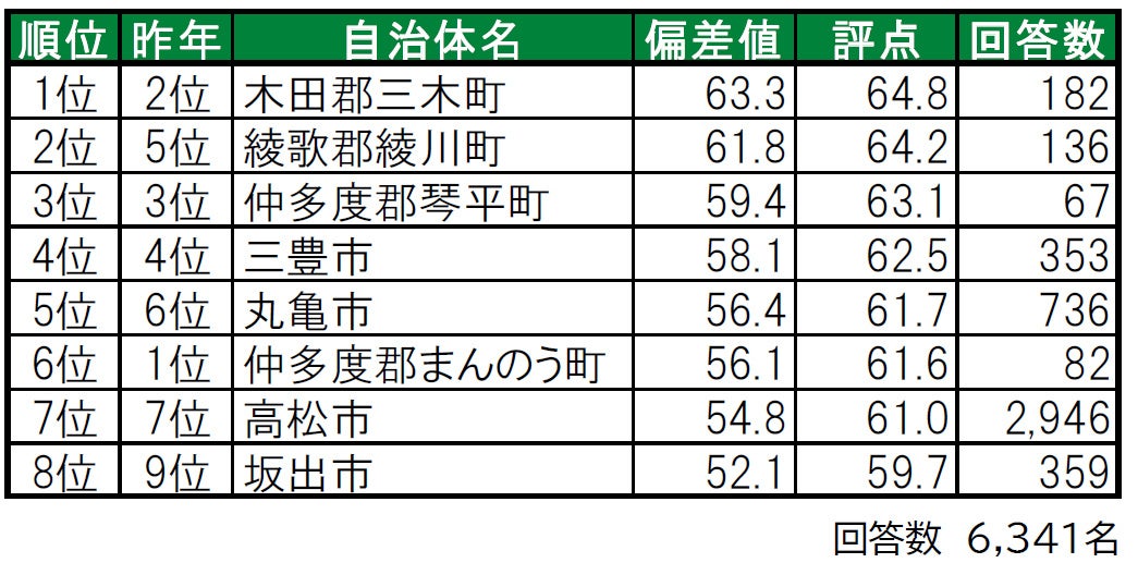 1位は木田郡三木町(昨年2位)、2位は綾歌郡綾川町(昨年5位)で、いずれも昨年から順位を上げました。3位は、2年連続で仲多度郡琴平町です。トップ3は、郡部に属する「町」という結果になっています。