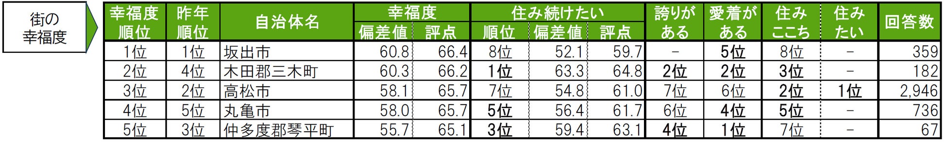 街の幸福度1位は2年連続で坂出市。2位木田郡三木町、3位高松市。