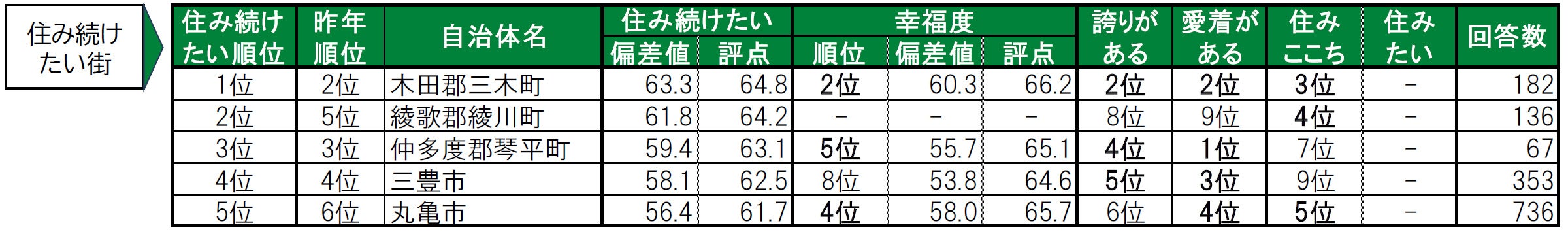 住み続けたい街は、1位木田郡三木町、2位綾歌郡綾川町。3位は2年連続で仲多度郡琴平町。