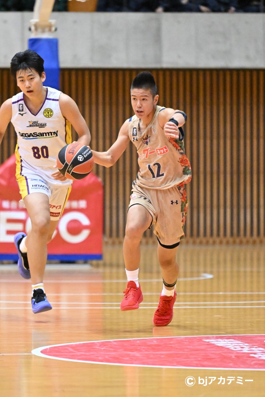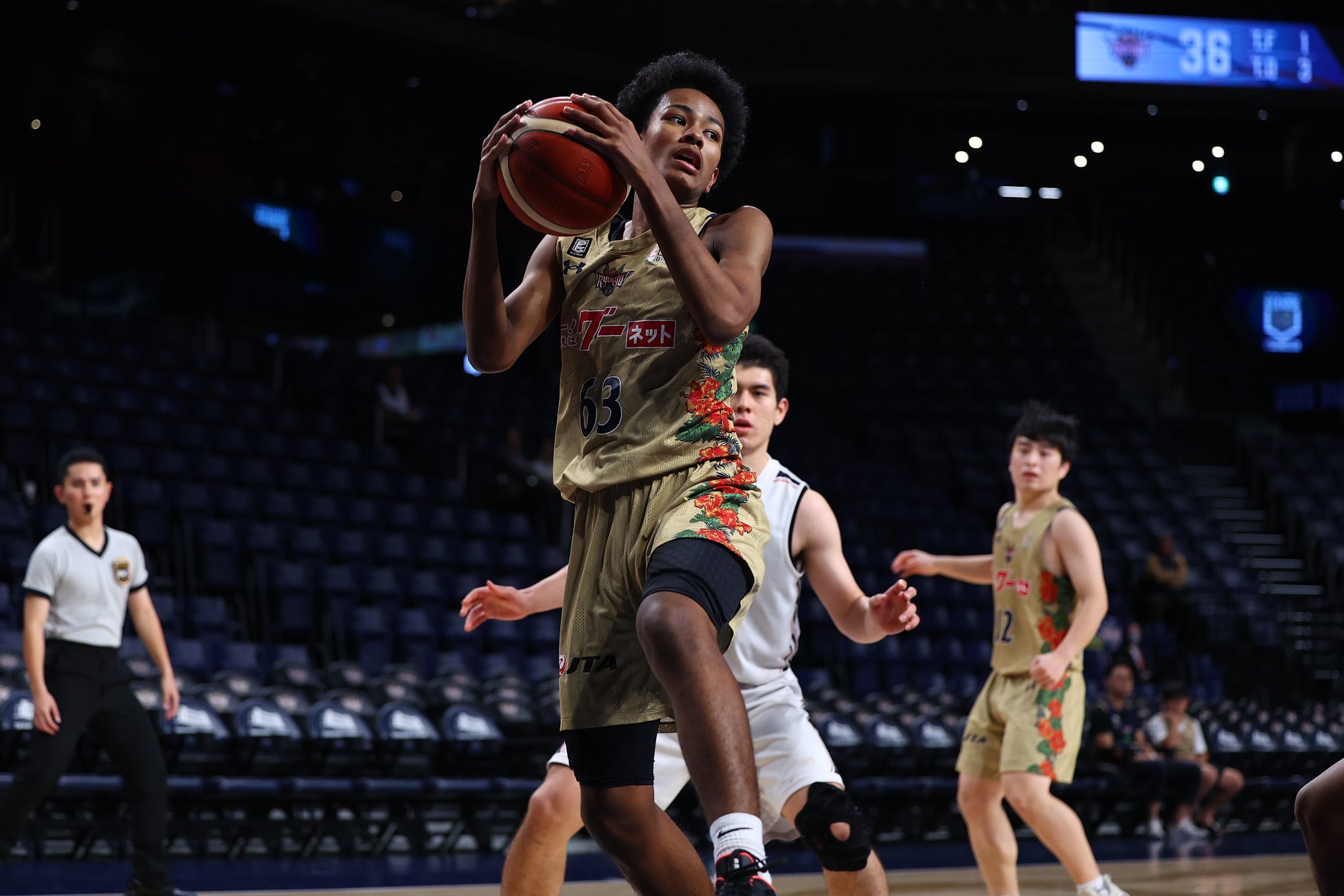 12月に行った名古屋ダイヤモンドドルフィンズU18、横浜ビー・コルセアーズU18との試合で、いずれもスターティング5に名を連ねたカマラ武佐選手。身長185cmでダンクシュートができるほどの高い身体能力、長い手足を武器に、リバウンドを中心にチームに貢献しています。