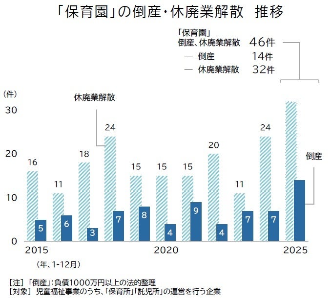2025年に発生した「保育園」運営事業者の倒産(負債1000万円以上、法的整理)は14件発生し、前年(7件)から倍増となった。また、休廃業や解散は32件(前年24件)あり、市場から退出した保育園運営事業者は計46件となった。前年(31件)に比べると15件(48.4%)の増加となり、年間で過去最多となった。
