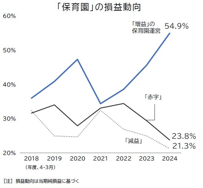 2024年度における保育園運営事業者の損益動向をみると、前年度から「増益」となった割合は54.9%を占め、2015年度以来、9年ぶりに半数を超えた。2024年度から、保育園の運営費(公定価格)のうち大部分を占める人件費が過去最大規模で引き上げられ、保育園の人件費負担が大幅に改善した。また、4〜5歳児を中心に保育士の配置基準が改定されたことで、基準以上の人員を既に確保していた園では新たな加算措置が適用され、運営収入が増加したことも利益を大きく押し上げた。定員割れが続いた園でも、一時預かりや病児保育などの新規収益源の確保や、調理室や事務部門などを高齢者デイサービスと一体化し固定費を削減する複合型福祉事業で利益を確保するケースがみられた。他方で、「減益」となった事業者は21.3%にのぼるほか、「赤字」も23.8%を占め、赤字・減益を合わせた「業績悪化」の割合は45.1%と、厳しい経営環境に直面している事業者も4割超を占めた。保育士の確保が難しい事業者では受け入れ定員の縮小を余儀なくされたほか、0〜2歳児を中心に定員充足率が低い園で人件費の固定費負担が重くのしかかった事業者もみられた。
