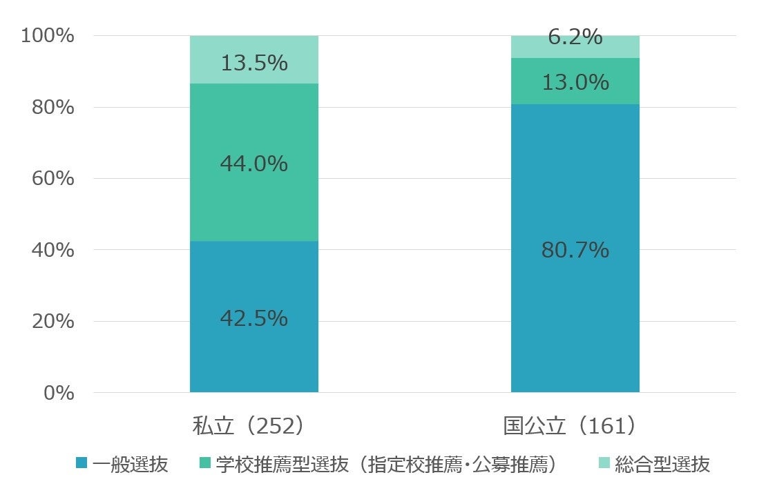 ・一般選抜の割合は、私立42.5%に対して国公立80.7%と、国公立のほうが明らかに高い。
