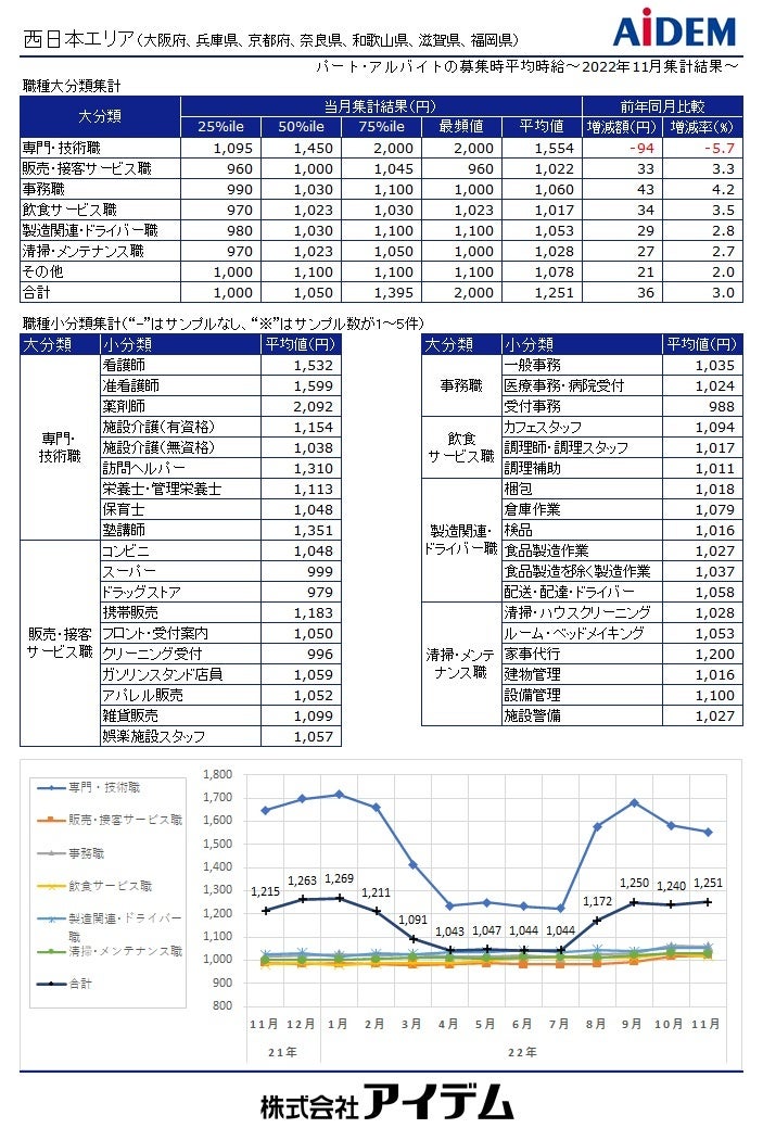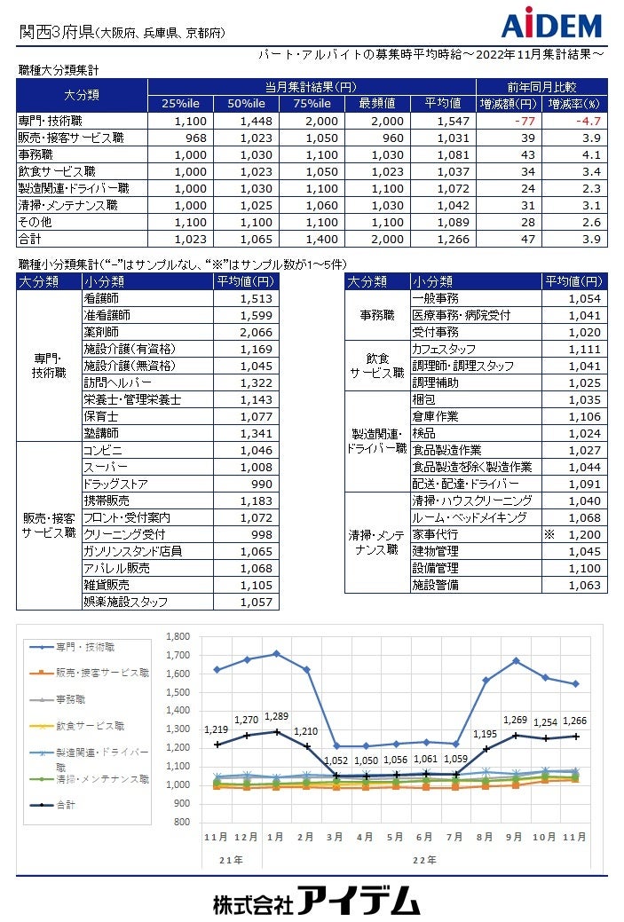 職種大分類別の平均時給は、「専門・技術職」1,547円(前年同月比77円減)、「事務職」1,081円(同43円増)、「製造関連・ドライバー職」1,072円(同24円増)、「清掃・メンテナンス職」1,042円(同31円増)、「飲食サービス職」1,037円(同34円増)、「販売・接客サービス職」1,031円(同39円増)の順で、前年同月比でプラスが5職種、マイナスが1職種となった。府県別の平均時給は、大阪府1,311円(前年同月比52円増)、兵庫県1,221円(同48円増)、京都府1,202円(同18円増)の順となり、前年同月比で全ての府県がプラスとなった。