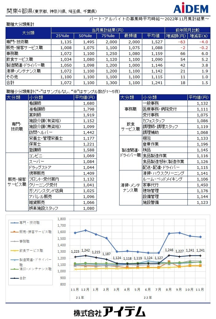 職種大分類別の平均時給は、「専門・技術職」1,527円(前年同月比63円減)、「事務職」1,159円(同66円増)、「製造関連・ドライバー職」1,146円(同42円増)、「清掃・メンテナンス職」1,142円(同21円増)、「飲食サービス職」1,090円(同54円増)、「販売・接客サービス職」1,088円(同2円減)の順で、前年同月比でプラスが4職種、マイナスが2職種となった。都県別の平均時給は、神奈川県1,276円(前年同月比24円増)、東京都1,249円(同18円増)、千葉県1,218円(同29円増)、埼玉県1,209円(同6円増)の順となり、前年同月比で全ての都県がプラスとなった。