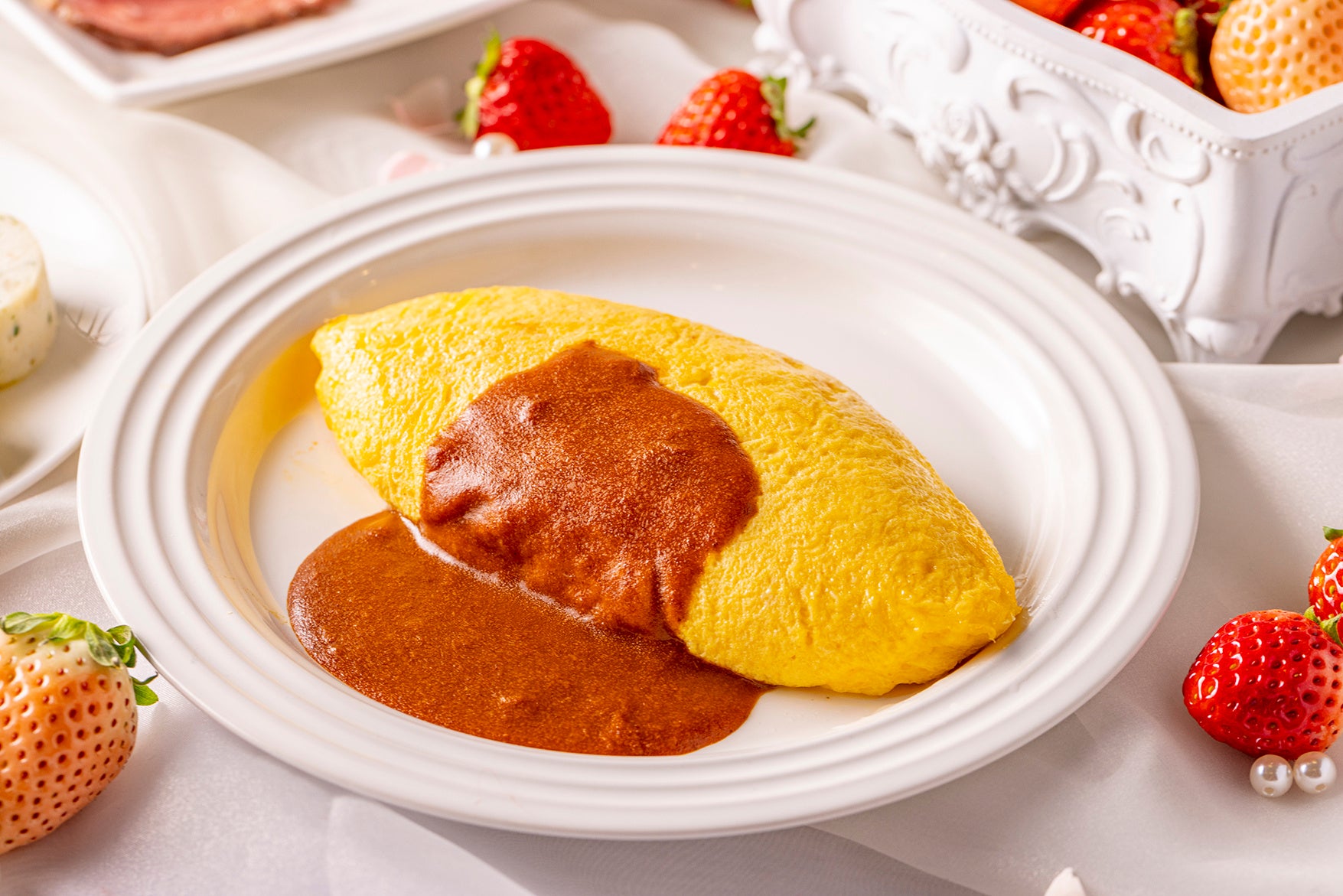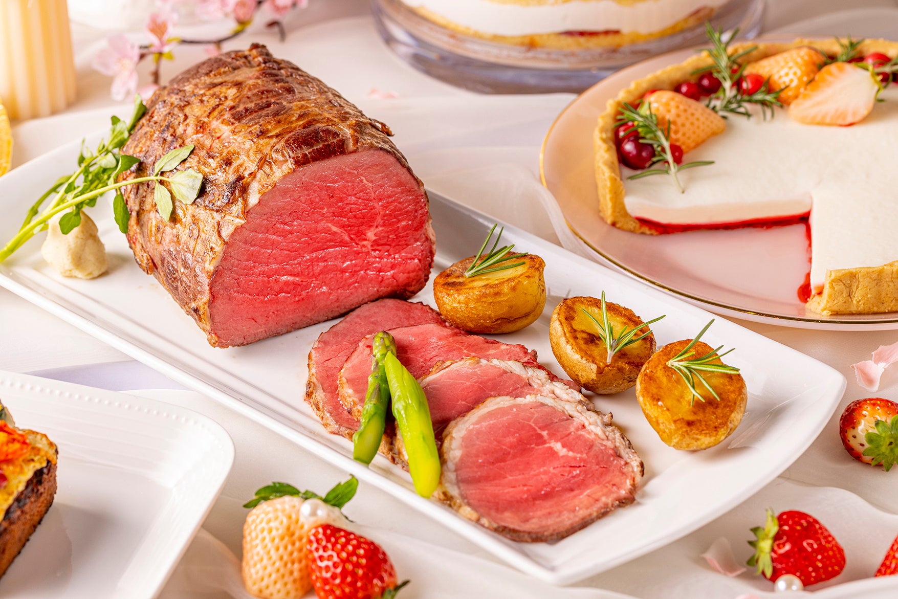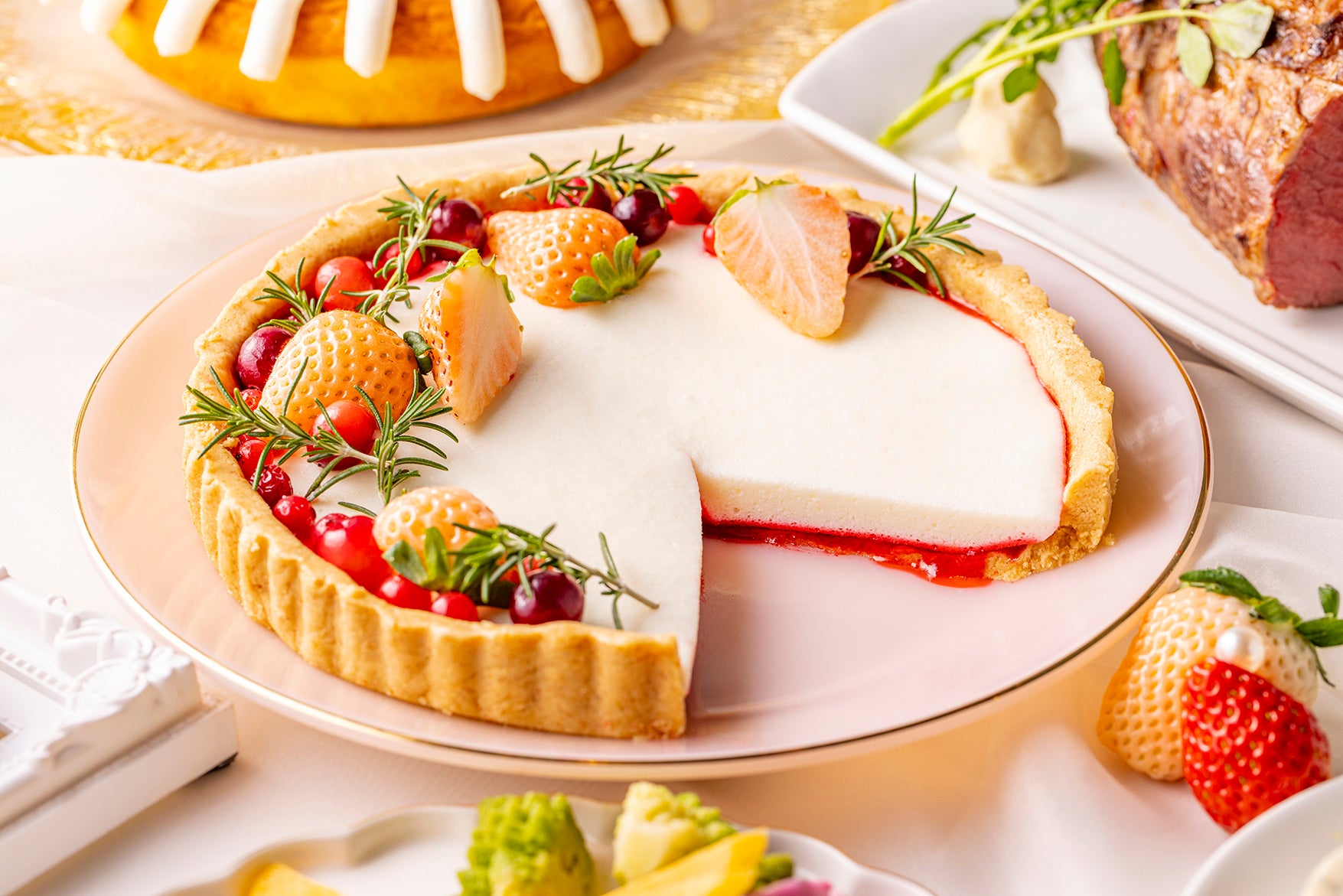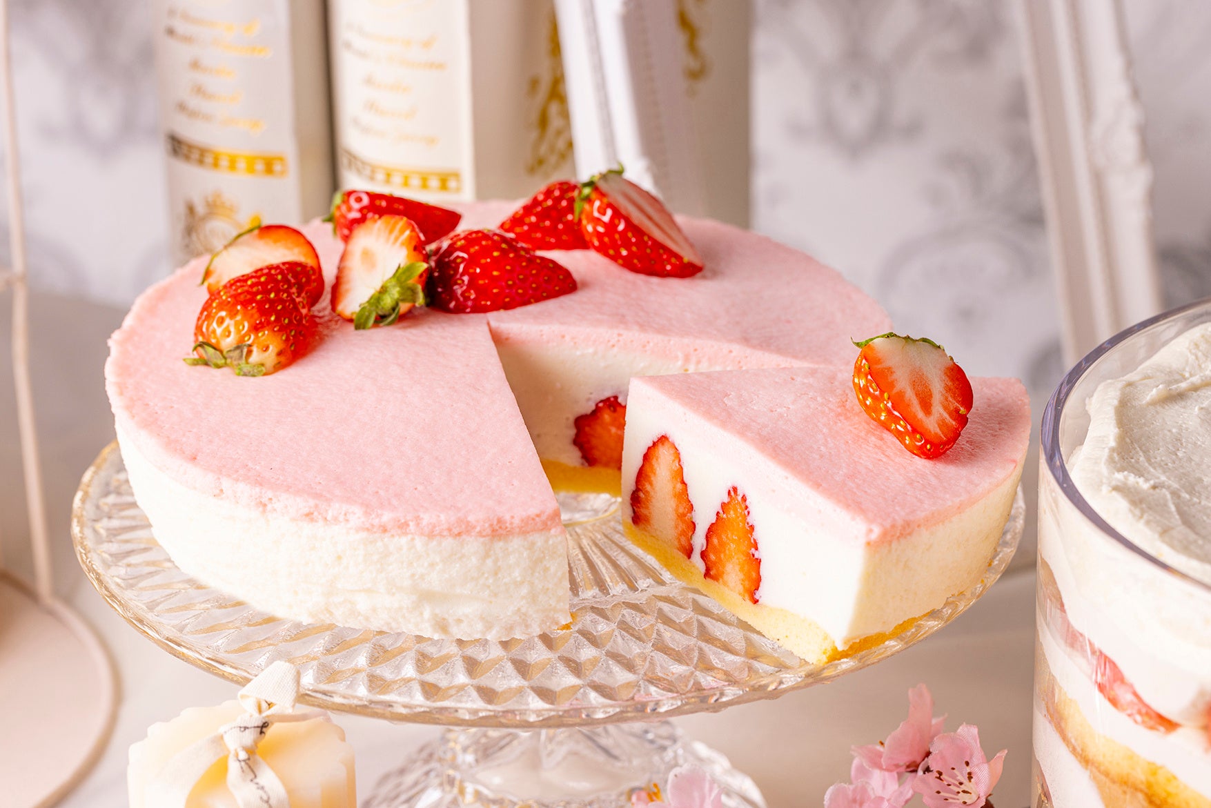 大きなガラスの器にスポンジと生クリーム、いちごを三層に重ねた「いちごのビッグトライフル」やパンナコッタに淡いピンクのジュレをのせた「ストロベリーヨーグルトのパンナコッタ 桜のジュレ」、「いちごと桜のムースケーキ」はムースの中にホールのいちごを入れて断面が美しく見えるようにカットされています。いちごのおいしさを引き立てるシェフ渾身のオリジナルデザートをお楽しみください。