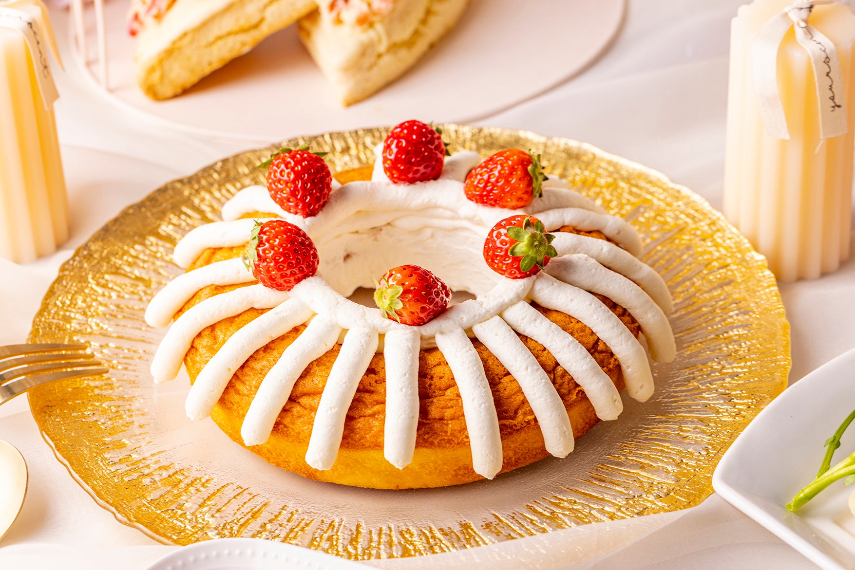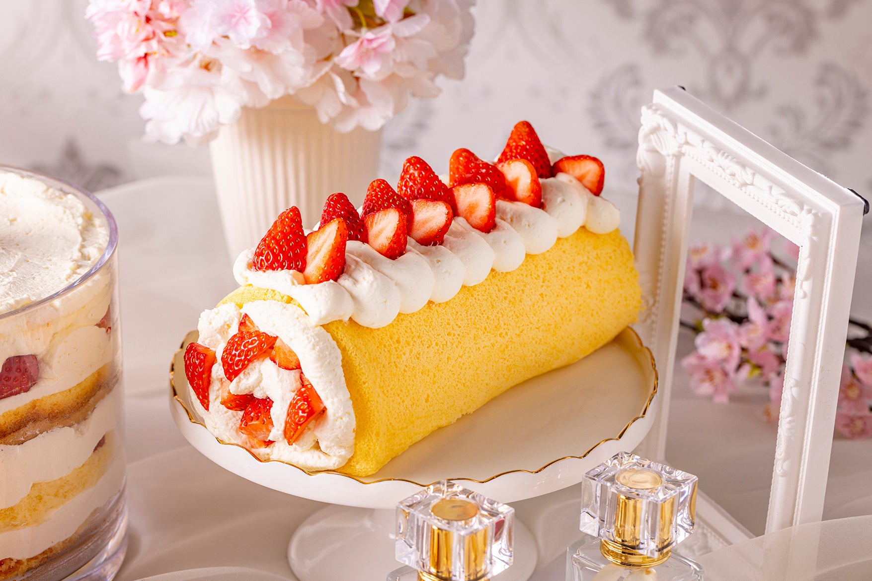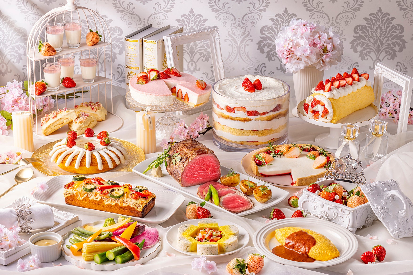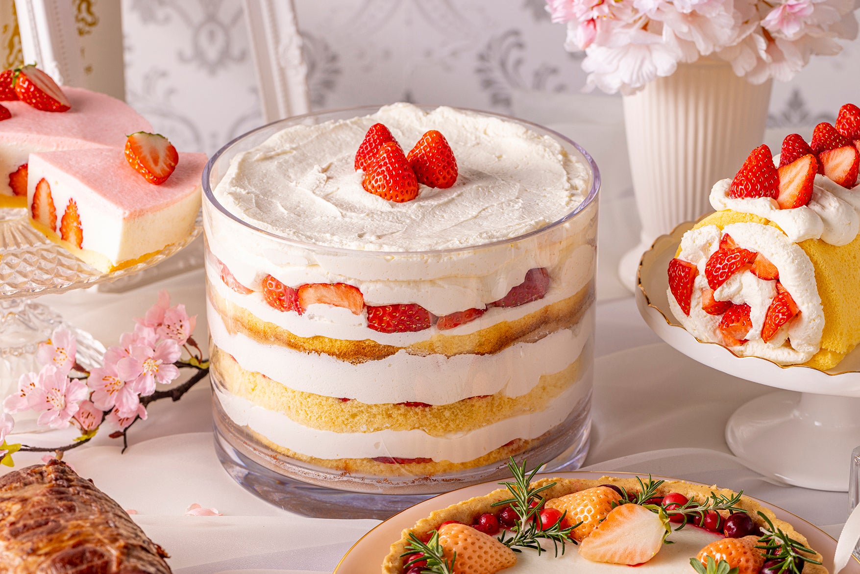いちごのビッグトライフル、白いちごとレアチーズタルト、ストロベリーロールケーキ、ストロベリーヨーグルトのパンナコッタ 桜のジュレ、いちごと桜のムースケーキ、ストロベリースコーンとホワイトチョコレートほか