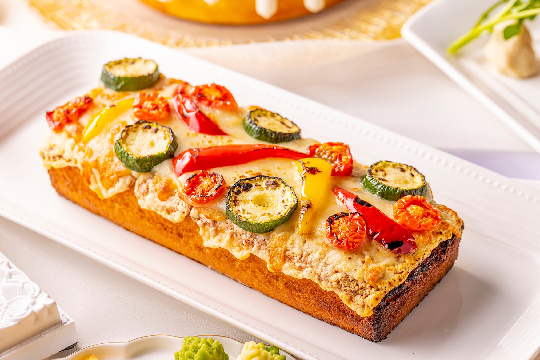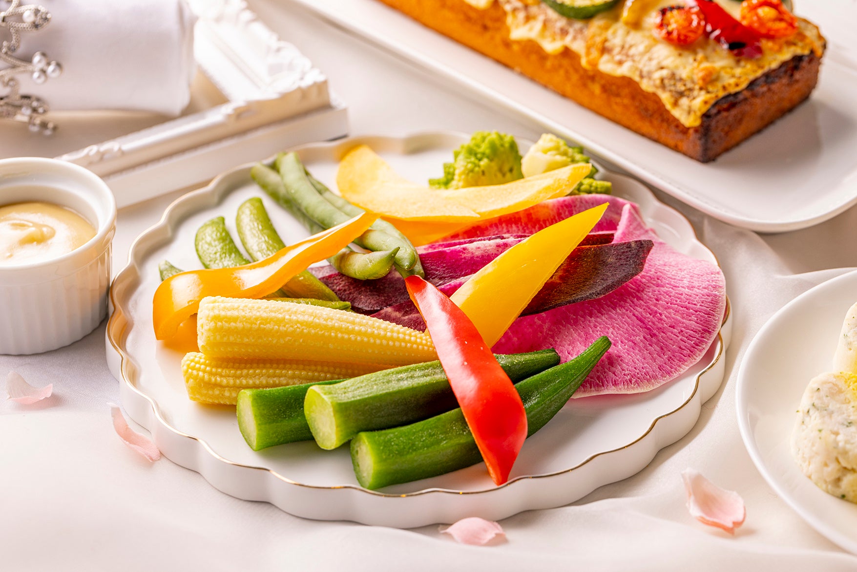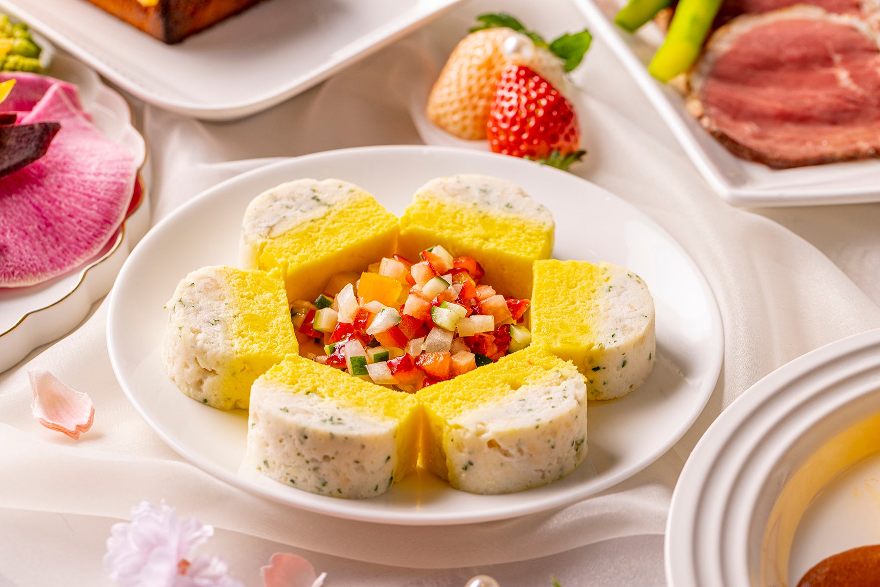 生地に、肉、野菜、チーズを入れて切り口が華やかな「塩味のケーキ」と言われる「ケークサレ」や「ホタテ貝と白身魚のムース いちごのラヴィゴットソース」、「桜海老とそらまめのフリッタータ」、「桜チップのスモークサーモンとブロッコリーのマカロニグラタン」など春の食材を使ったお料理と白いデザートをぜひ、写真におさめて目でもお楽しみください。