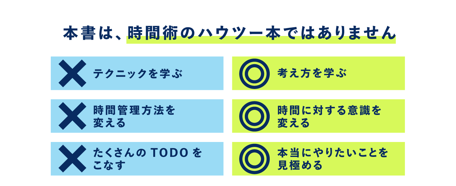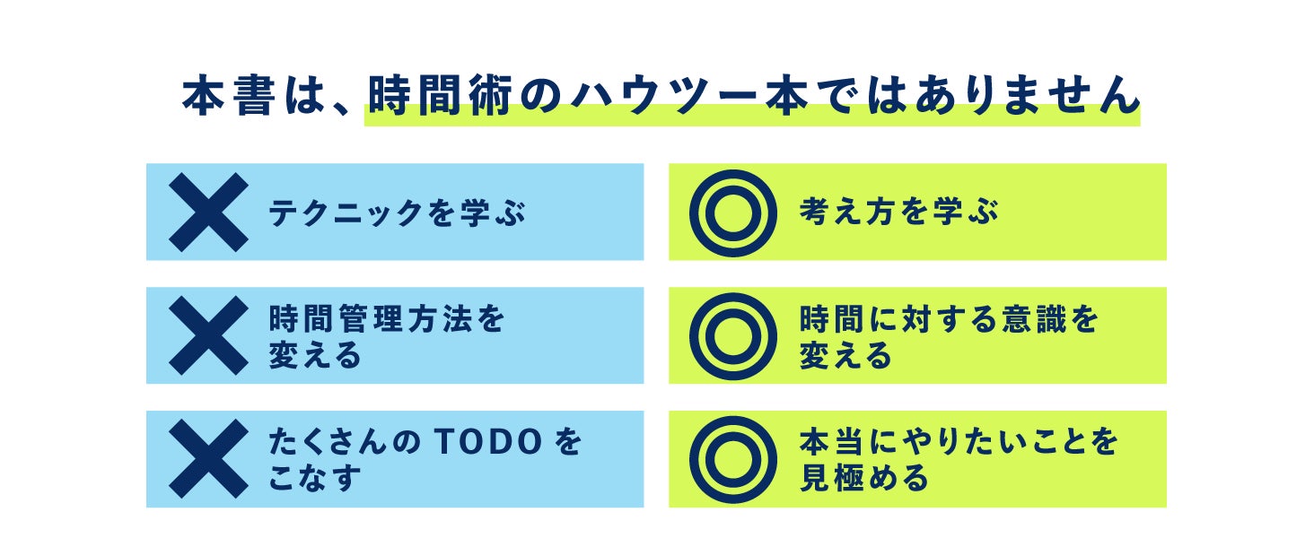 課題について論じるだけでなく、随所に散りばめられたエクササイズが、私たちの時間にまつわる「視点」の切り替えをサポートします。本書は、単なる時間管理術のハウツー本ではなく、時間に対する意識を根本から改革し、本当に有意義な時間の過ごし方について教えてくれます。