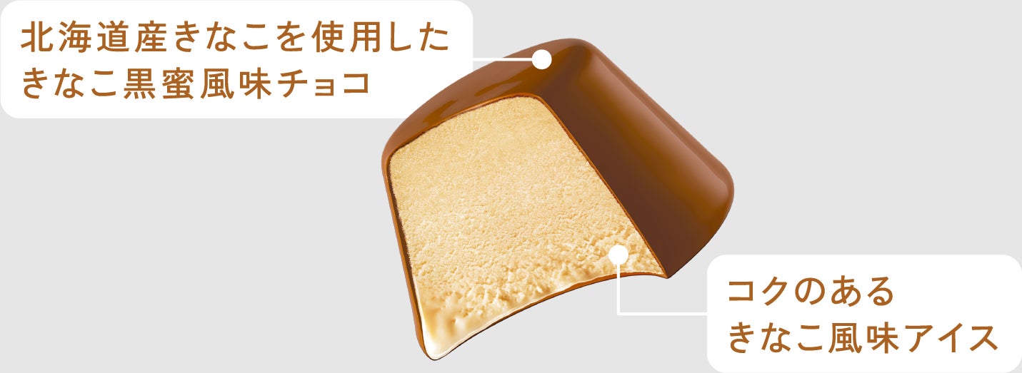 ②きなこ風味のアイスを、コクのあるきなこ黒蜜風味のチョコでコーティングした、ひとくちアイスです。