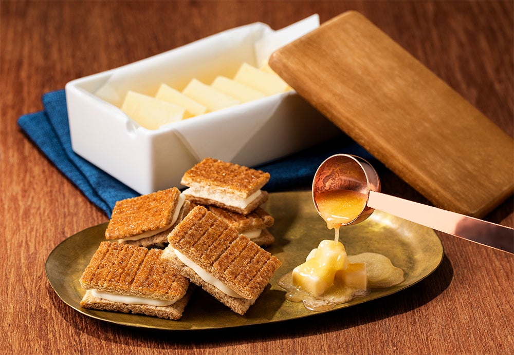 香り豊かなフランス産発酵バターを生地にじゅわっとしみこませ、香ばしくパリッと焦がし焼きしたサクサクの生地。まるで空に浮かぶ雲のようにもこもこなエアインショコラをサンドしました。ひとくちかじれば、発酵バターの贅沢な香りと ショコラのミルキーな風味がお口いっぱい広がります。