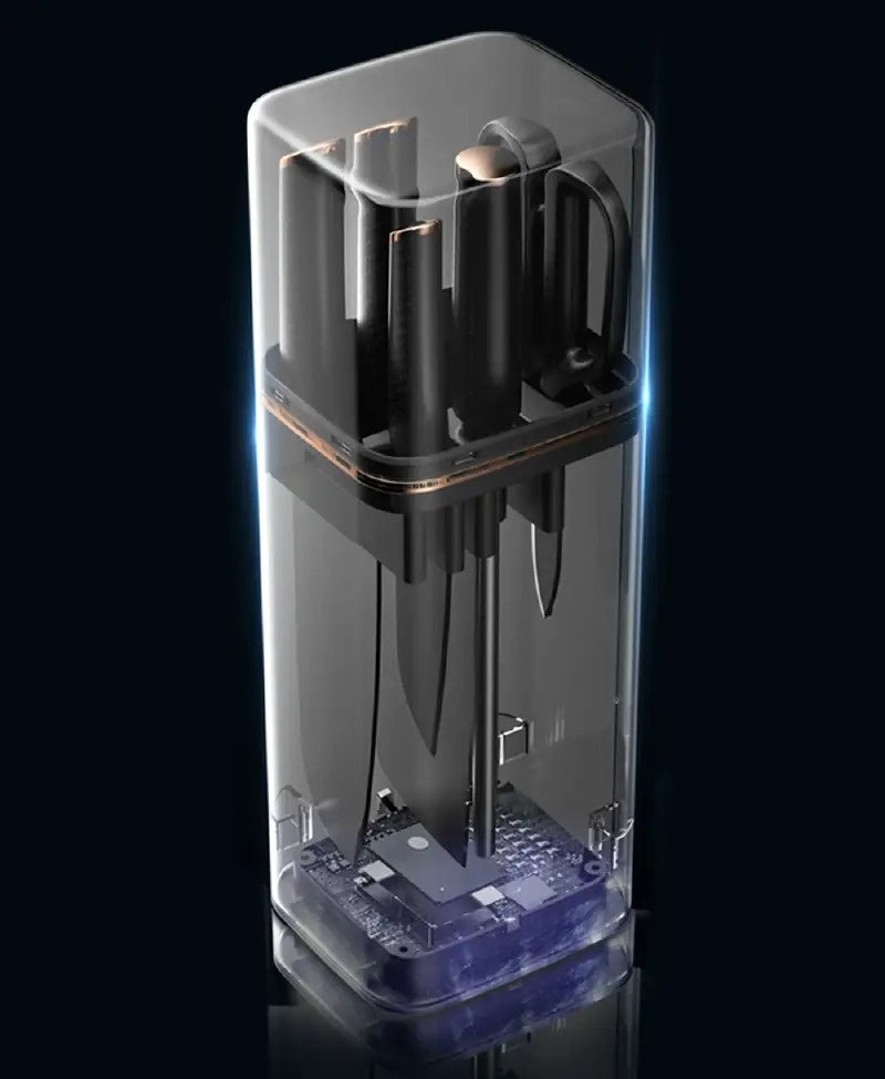 同梱物:UVC除菌ボックス、牛刀包丁、菜切包丁、中華包丁、果物ナイフ、キッチンバサミ、研ぎ棒、USB充電ケーブル