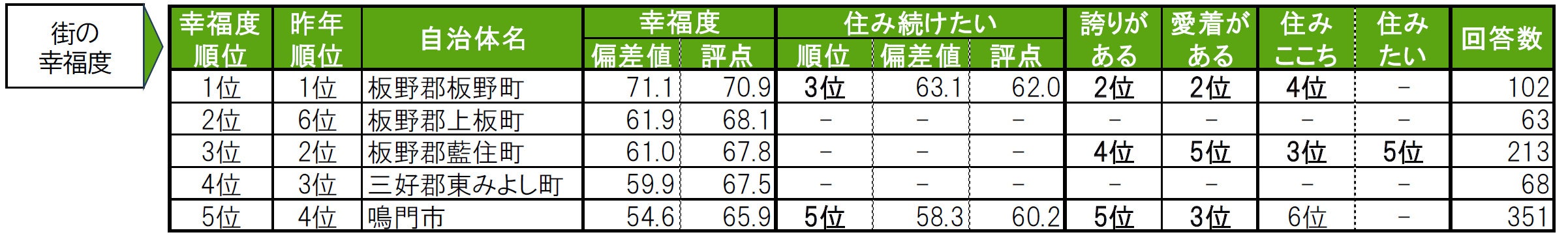 街の幸福度のトップ3は全て板野郡の町。1位は4年連続で板野町。2位上板町、3位藍住町。