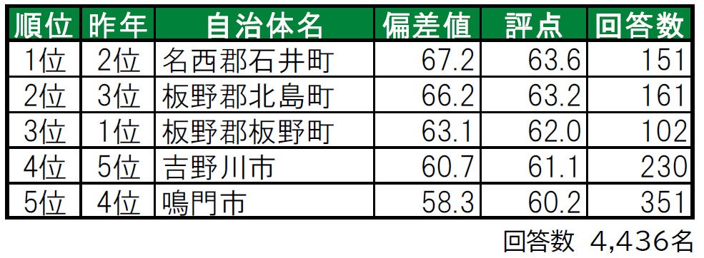 名西郡石井町が、昨年2位から順位を上げて1位に輝きました。2位は板野郡北島町、3位は板野郡板野町で、いずれも板野郡に属する町です。トップ3は、全て郡部に属する「町」という結果になっています。
