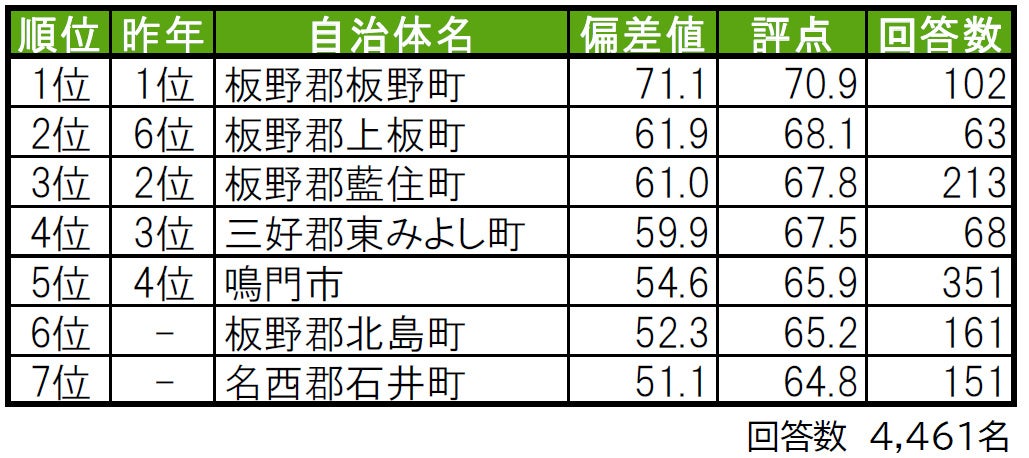 1位は4年連続で板野郡板野町で、唯一偏差値70台の高い評価を得ています。2位は板野郡上板町で、昨年6位から順位を上げました。3位は板野郡藍住町で、トップ3は全て板野郡に属する町という結果になっています。その他、昨年から順位を上げてトップ7入りしたのは、6位板野郡北島町(きたじまちょう)、7位名西郡石井町(みょうざいぐん いしいちょう)(いずれも昨年は偏差値50未満のため順位非公開)で、トップ7のうち6つが郡部に属する「町」という結果になっています。