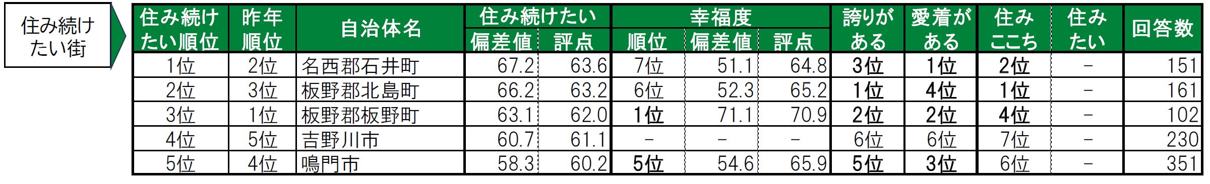 住み続けたい街は、1位名西郡石井町、2位板野郡北島町、3位板野郡板野町。