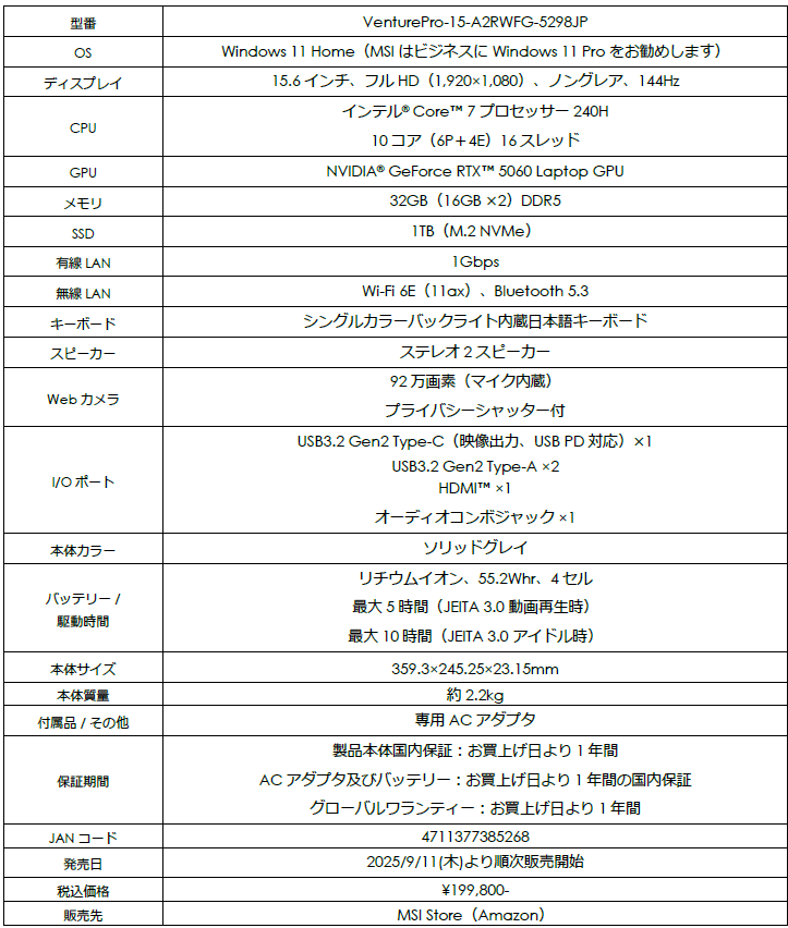 この度、エムエスアイコンピュータージャパン株式会社は、15.6インチの本体に「インテル® Core™ 7 プロセッサー 240H」と「NVIDIA® GeForce RTX™ 5060 Laptop GPU」を搭載したハイスペックノートPC「VenturePro 15 A2RW」シリーズより、メモリ32GB・SSD 1TBを搭載したAmazon限定モデル「VenturePro-15-A2RWFG-5298JP」を本日2025年9月11日(木)より販売開始いたします。